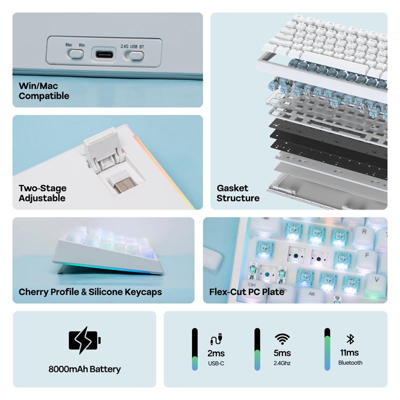 Wire-free, Worry-Free: Powered by a massive 8000mAh battery that offers weeks of usage with the backlight off, the G84 PRO Wireless Mechanical Keyboard comes with three versatile connection modes for PC, laptop, tablet, phone, or Android smart devices. Switch to 2.4Ghz or wired mode for competitive gaming or critical tasks, with blazing-fast 1k polling guaranteeing speed and stability, or the Bluetooth mode that connects up to 3 devices simultaneously for maximum portability and convenience. Emailing on a laptop, chatting on the phone, or switching back to PC for immersive gaming, the G84 PRO wireless keyboard is the stability you need, for all situations, everywhere you go.