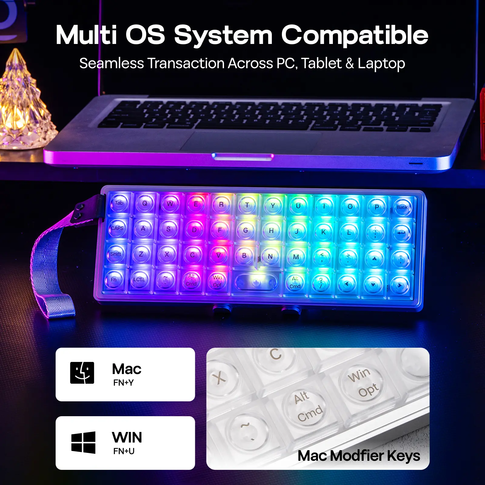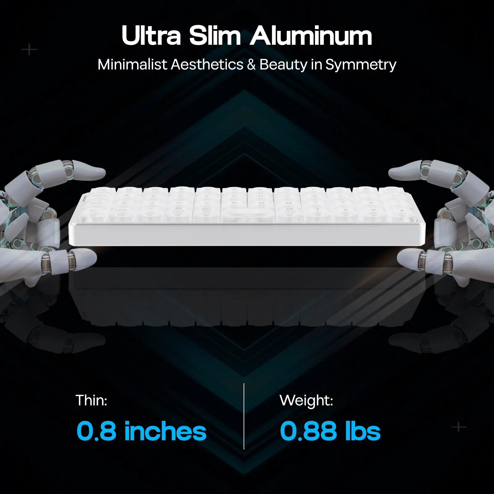 Beauty in Symmetry: Minimalist Aluminum Aesthetics: Meticulously crafted from smooth, CNC-cut aluminum, the Luma40 aluminum keyboard is a statement piece for any desk. The aesthetics are rooted in minimalism with the unique 40% layout, with semi-transparent frosted white keycaps that elegantly diffuse the keyboard's RGB backlight. The legends and mac adapted signs are silk-screen printed, a subtle detail that adds to the refined look. The unique key alignment provides a cleaner visual, while the brand-embossed metal badge on the back adds a modern, elegant touch to the overall sleek design.