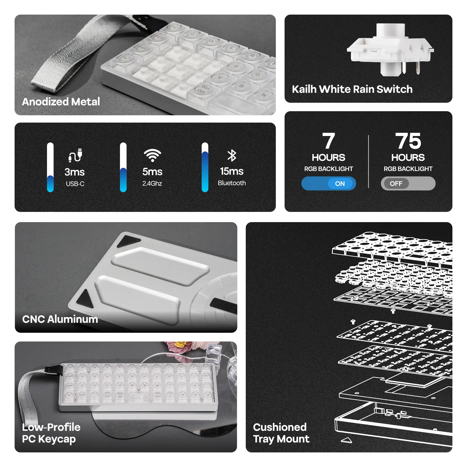 Padding Cushioned Tray-Mount: The Luma40 Low-Profile Keyboard comes with a superior shock-absorbing design, where layers of soft foams cradle the PCB from the metal frame. Every keypress is dampened to be satisfying with pleasing deep sound profile. The lubed low-profile switches, in half the height of traditional mechanical switches, puts less stress on your wrist to prevent pain from carpal or muscles strain.