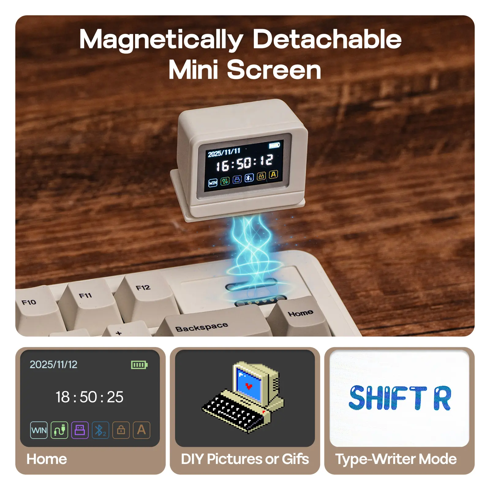 Detachable LCD Screen: Experience the revolutionary PC peripheral designed for modern users. The EPOMAKER RT82 mechanical keyboard features a magnetically detachable LCD screen that offers customization and utility. Stay productive without breaking your focus, as RT82 keeps essential information like the date, time, and keyboard battery right at your fingertips; tune-in with your writing, with type-writer mode where every letter input appears on keyboard’s screen in real-time, or turn your desk into a vibrant expression of your personality, and display up to 3 saved GIFs on the RT82 keyboard for a touch of personal flair