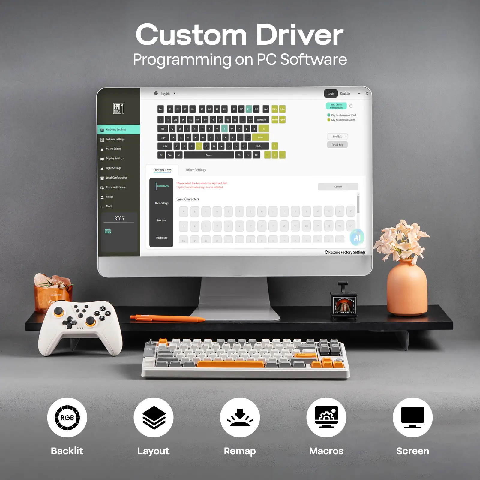 Programming Software: Remap layouts, record macros or toggle backlight and sensitivity, the programming software of RT85 gaming keyboard transform your desk into your personal command center. Tired of stretching fingers or missing crucial inputs? Remap keys for a personalized layout that streamlines the computing experience. Multi-spell combo or repetitive office tasks, use macros to automate the process to a single key press, freeing you to enjoy the game without breaking stride.