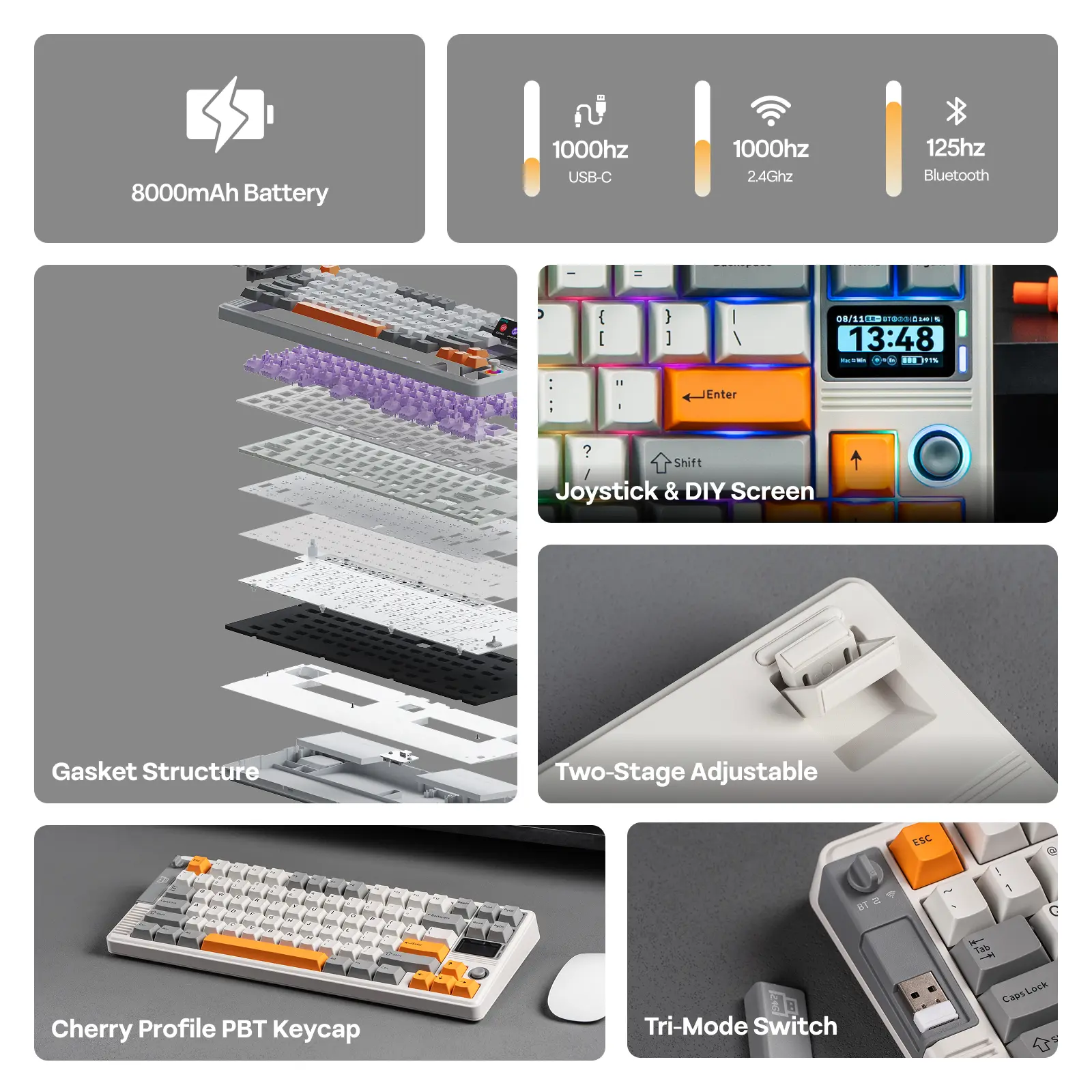 8000mAh & 1000hz Polling: Engineered for relentless performance and unwavering reliability, our RT85 wireless gaming keyboard is powered by a massive 8000mAh battery, for 90 hours of continued use with screen displaying at its brightest and 320 hours with screen and lights off. With 1000hz polling rate in cable and 2.4Ghz wireless mode, every keypress is responsive and consistent, for a perfectly fluid typing experience that keeps up with your every command, from the first click to the last.
