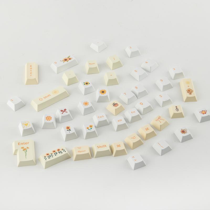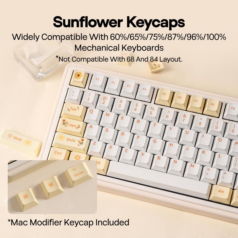 Mac Modifier Keycap Included: Designed for versatility, the Sunflower Keycap Set is specially equipped with modifier keycaps intended for Mac, covering essential keys such as Command (⌘), Option (⌥), Control (⌃), and Function (fn). The set takes into full account the unique keyboard layout and functional requirements of macOS, aiming to restore the familiar tactile experience for Mac users while providing an optimized typing experience