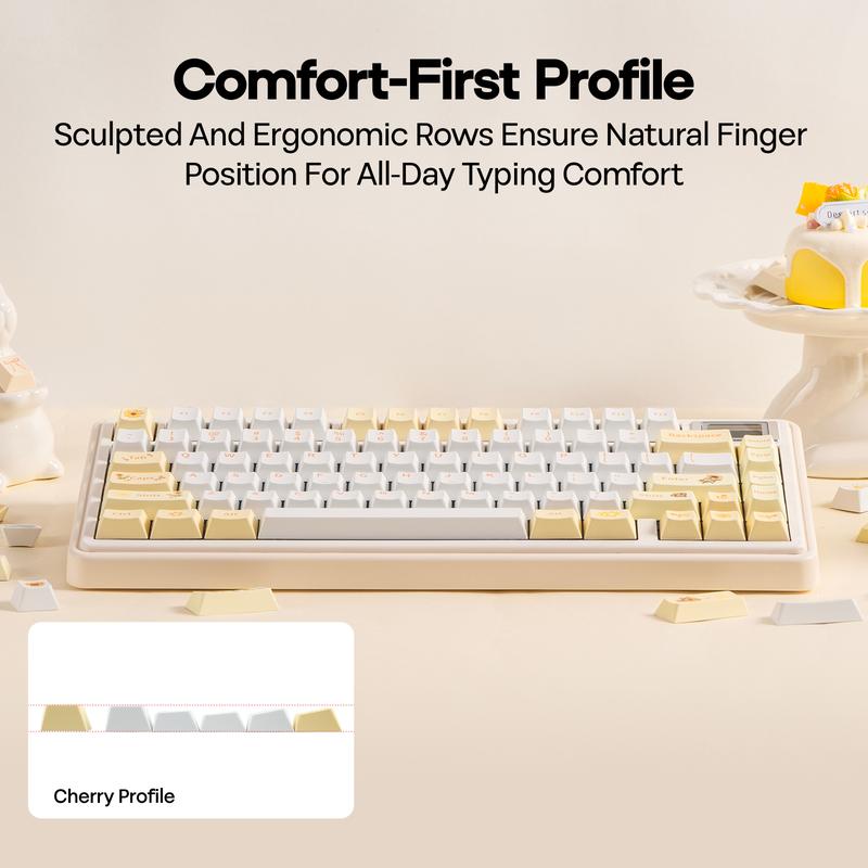 Comfortable Cherry Profile Keycaps: Designed with ergonomic height differences between R1-R4 rows, the Sunflower keycap adopts the wrist-friendly tilt angles of Cherry profile for unbeatable typing comfort. The taller R1 row makes reaching for F1-F12 rows much easier without overly stretching your fingers, while the lower R2-R3 cut back pressure on your wrist while typing