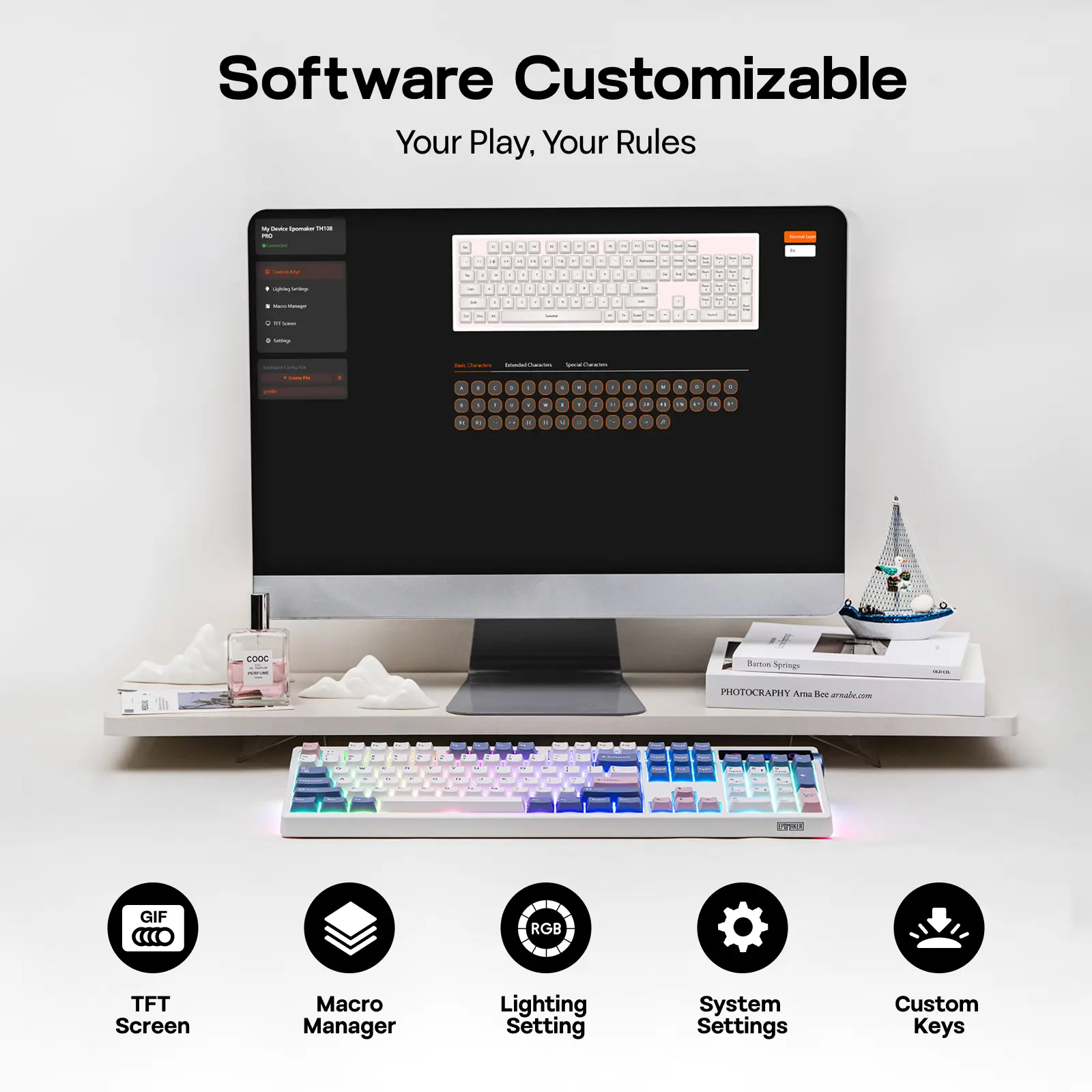 PRO with Screen, Upgrade on Display: Featuring a sophisticated smart screen, the TH108 PRO gaming keyboard puts vital information and personalised flair right at your fingertips. With this powerful display, instantly verify the time, monitor keyboard power, or toggle RGB backlight with the volume knob doubles as screen control (FN+Knob to switch), without losing focus. Easily upload your own GIFs or pictures with the Chrome-based software on Mac or WIN computers; to flaunt the team you battle for or show off a perfectly timed meme that puts a smile on your face. With the custom screen, express your unique style that moves beyond static backlight.