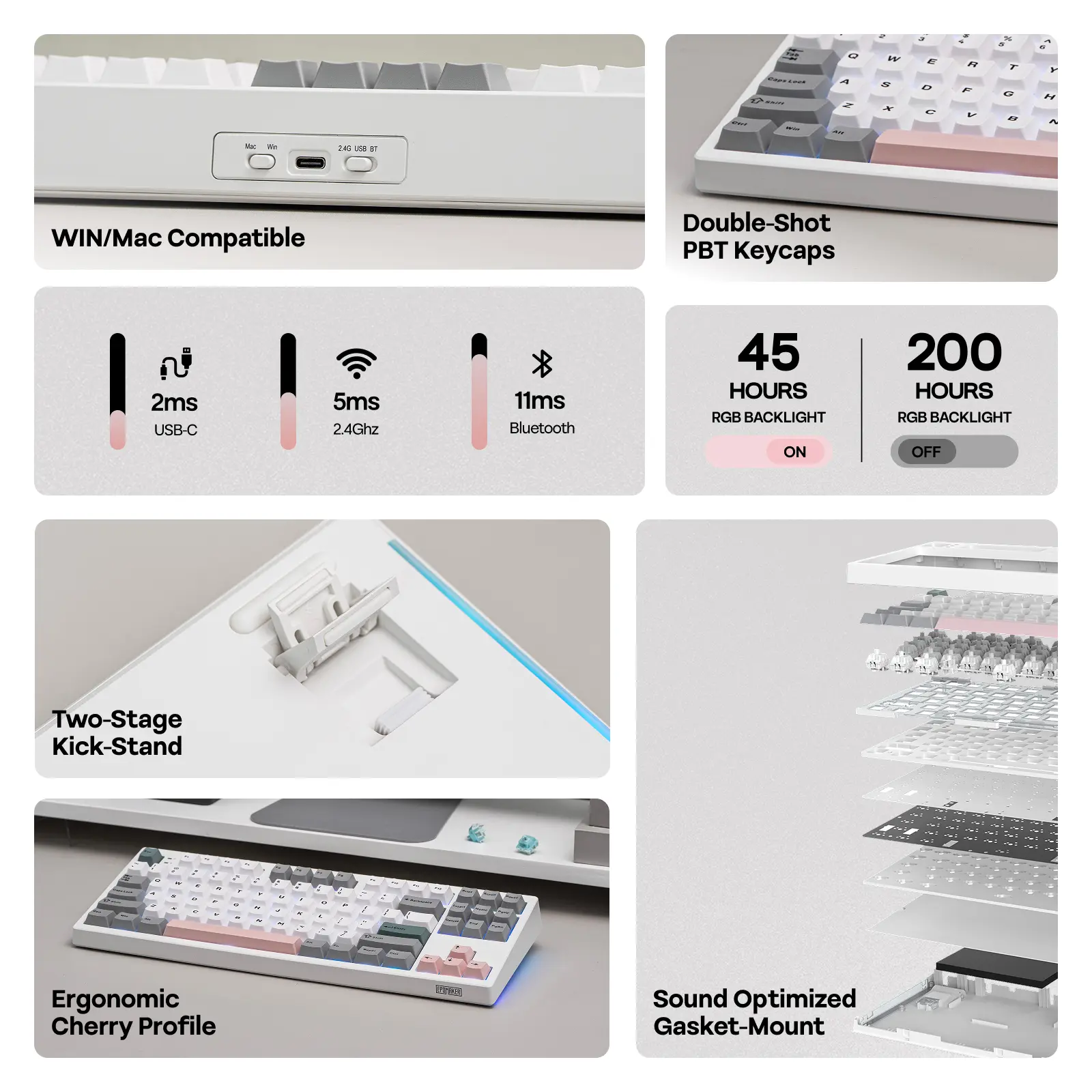 Creamy Keyboard with Satisfying Sound: Immerse yourself in the ultimate typing experience in sound, comfort, and feel, with the EPOMAKER TH87 keyboard, where every keystroke is a symphony. Featuring a 5-layer sound optimizing system that expertly absorbs shock, suppresses hollow noises, and eliminates metallic pings, this creamy keyboard delivers satisfying thocky sound that’s deep and clean. Comfort is also unparalleled, thanks to the cushioned, softer bottom-out feel of Gasket design and the ergonomically shaped Cherry profile PBT keycaps that gently cradle your fingers' movement. Plus, the adjustable kickstand offers three precise typing angles, ensuring maximum comfort.