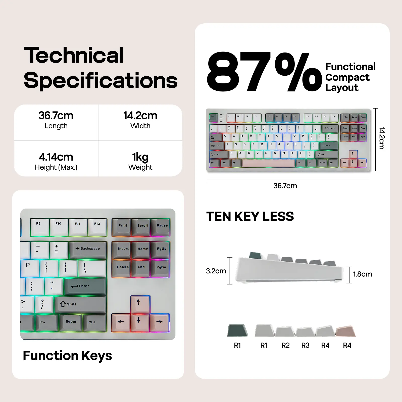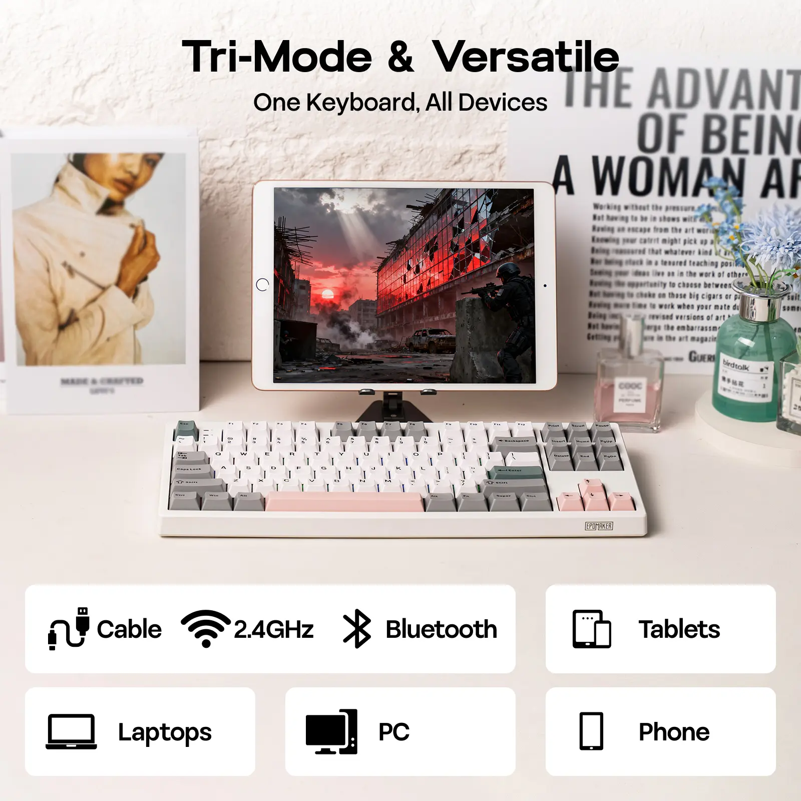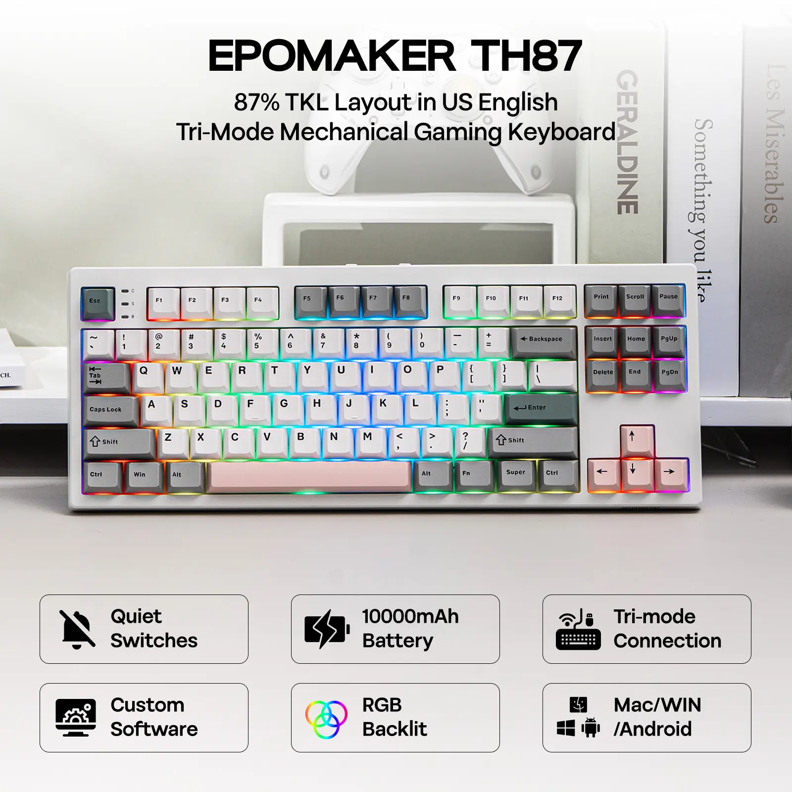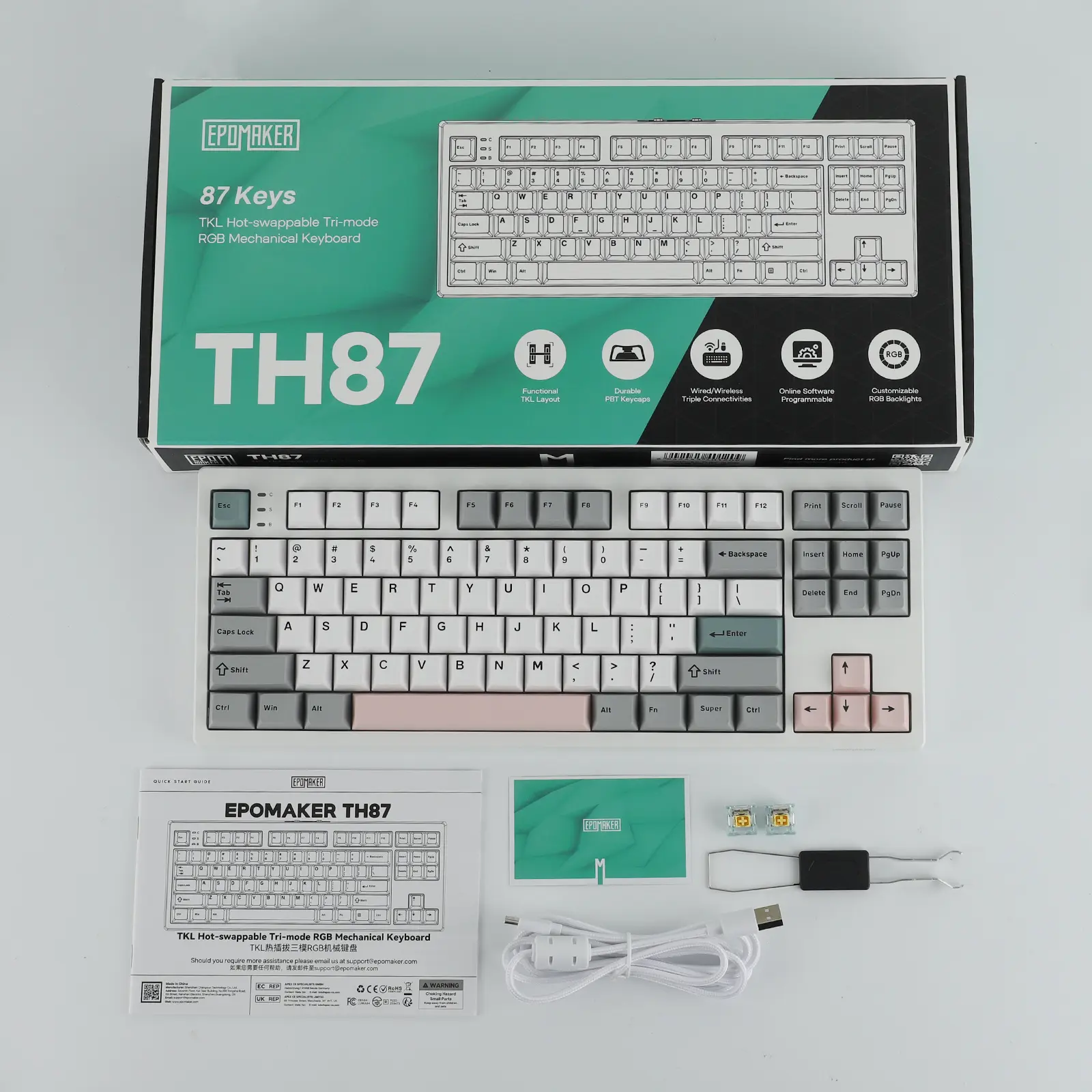 Soft Minimalist Style in Tenkeyless Layout: Featuring the compact tenkeyless layout, the TH87 TKL keyboard preserves all essential keys in a standard key map with comfortable spacing, for hassle-free transition from a full-sized layout, while reclaiming space for sweeping your mouse. Functional and stylish, this 87-key gaming keyboard is clean, crisp, and architectural with cool gray, soft teal, and light blush. Whether you're using it to crush deadlines in a sleek professional office or streaming your latest victory from your home battle station, the EPOMAKER TH87 will blend in elegantly while still making a stylish statement.
