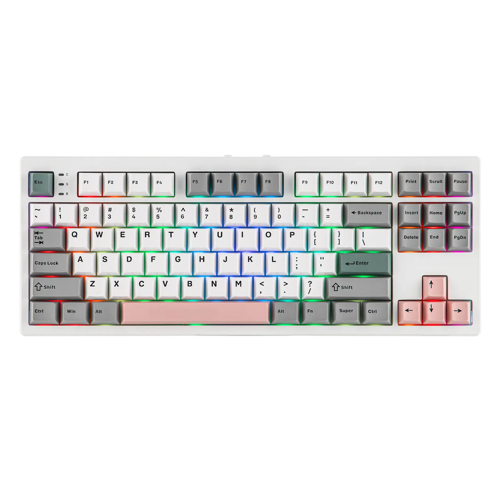 RGB: Yes, the TH87 RGB Backlit Keyboard has per-key adjustable south-facing LEDs, offering dynamic and static lights in RGB and singular colors.
