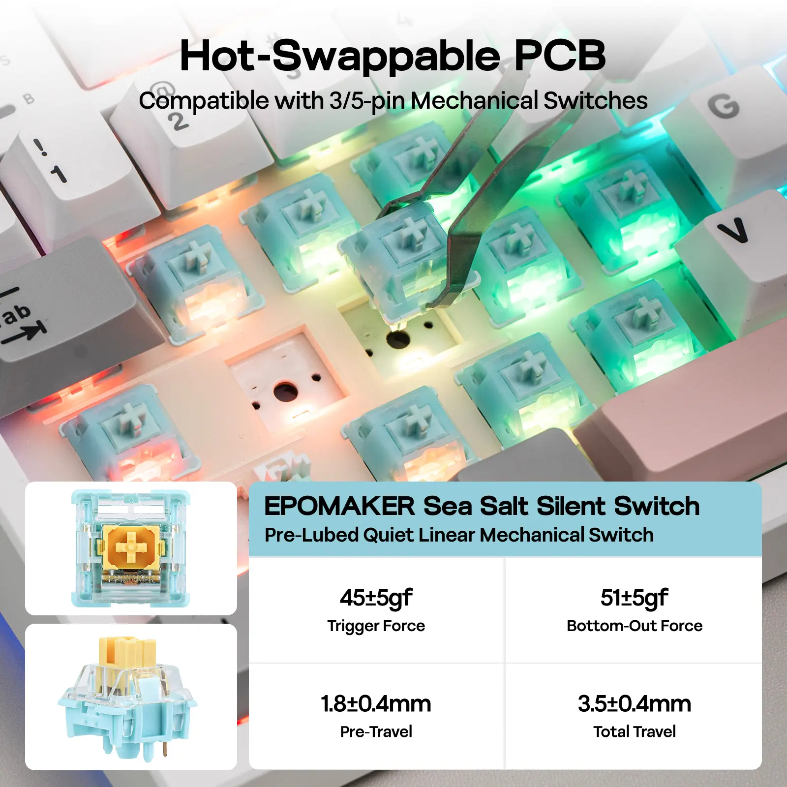 Switch Type: 5-pin Mechanical Switch, Silent, Linear, Pre-Lubed