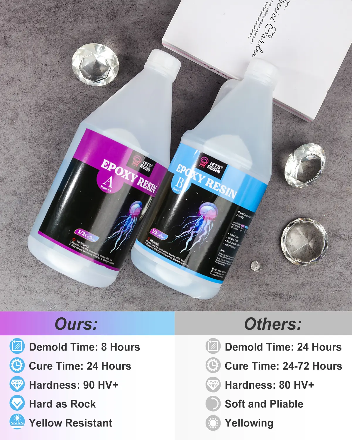 ·Safe and easy to use:Our clear epoxy resin are made of safe and premium materials. The self-leveling resin epoxy mixed in a 1:1 volume ratio, is easy to operate and requires no experience, even if you are new to resin.It usually takes 8-24 hours to cure in summer and longer in winter. How to Use epoxy effectively in cold weather:Warm resin and hardener before using.And warm working surfaces.