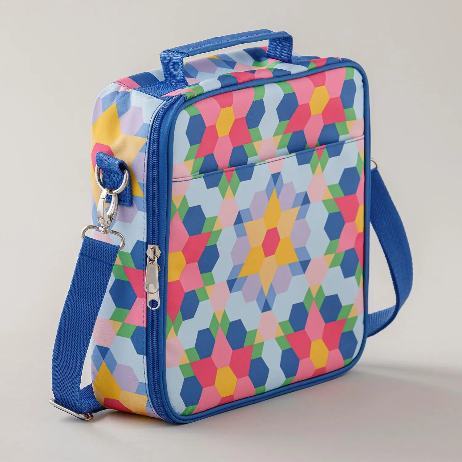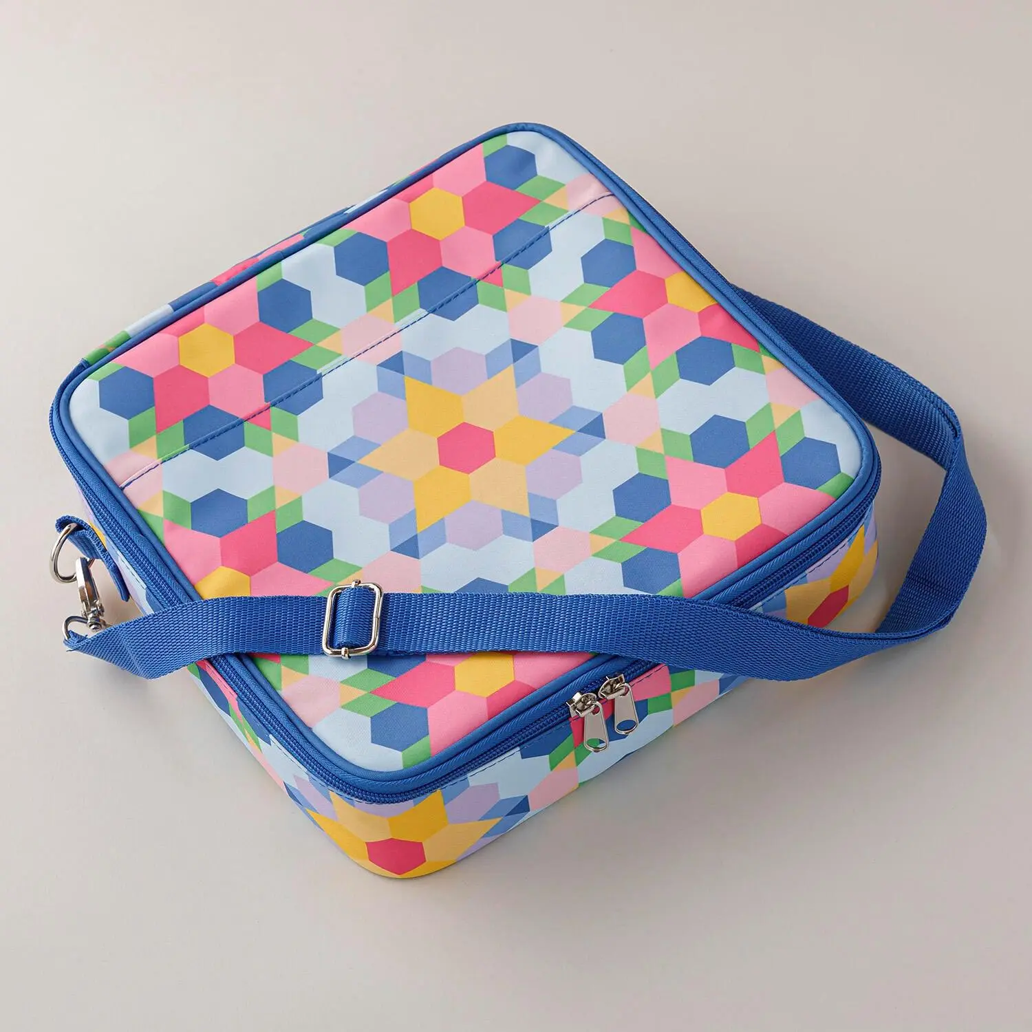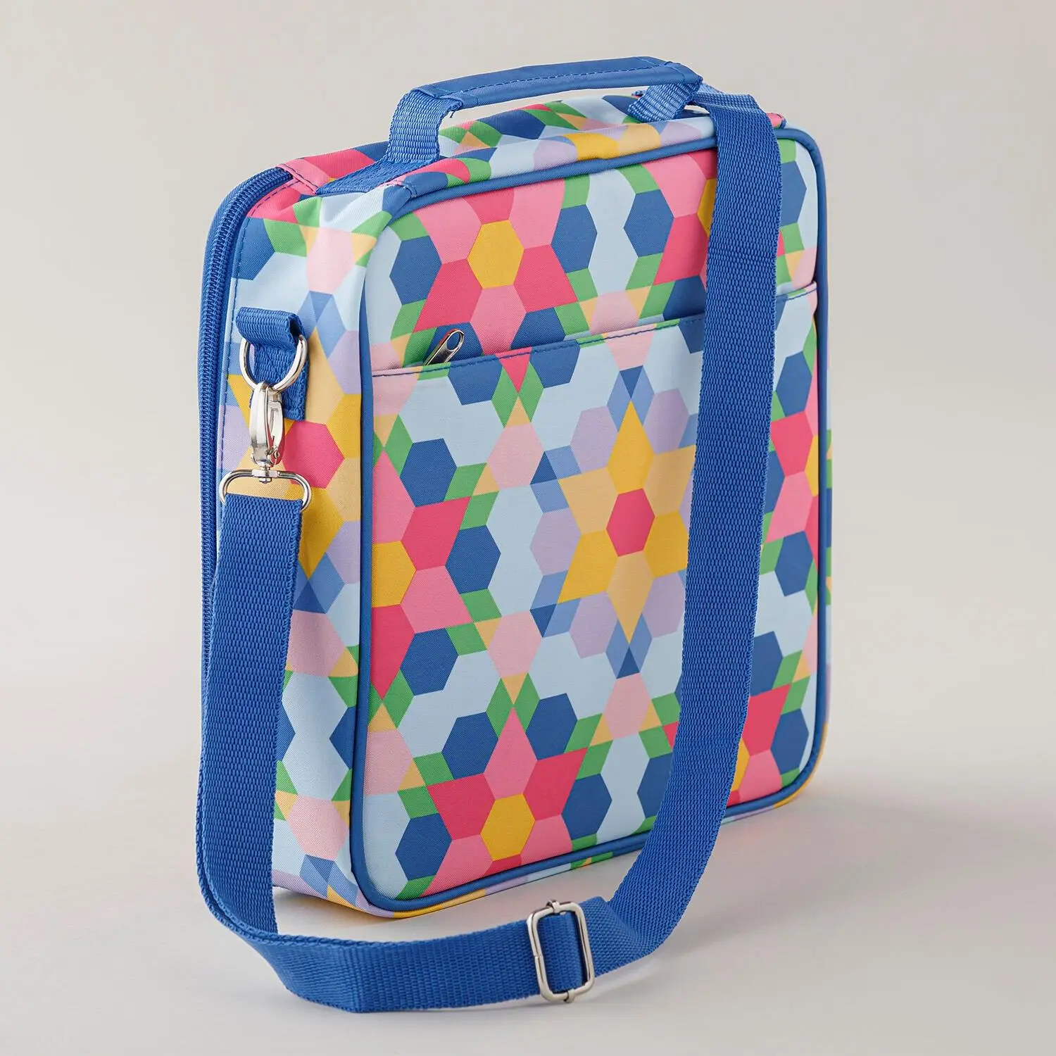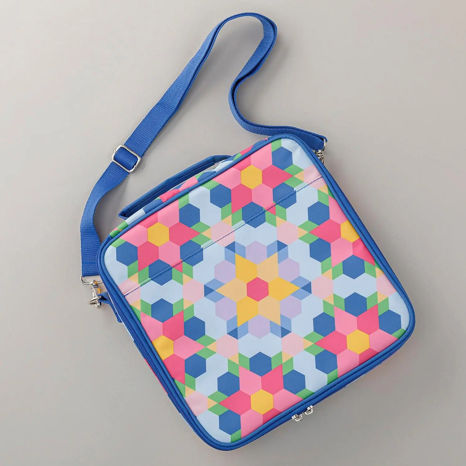11-3/4" x 11-3/4" zippered case with adjustable shoulder strap, multiple interior and exterior zippered pockets, removable clear pouches, and interior divider straps#10 and #11 hand sewing needlesNeedle threaderHexi flower needle minder250-yard spool MSQC Sebring silver cotton 47/3 thread Aqua tint glue stick6" diameter rotating cutting mat6" floral scissorsEPP papers100 1-½" hexagons50 1-½" triangles50 1-½" diamonds50 1-½" teardropsEnglish Paper Piecing Basics booklet16" x 13" x 4" canvas tote bag to get you started on your first project!