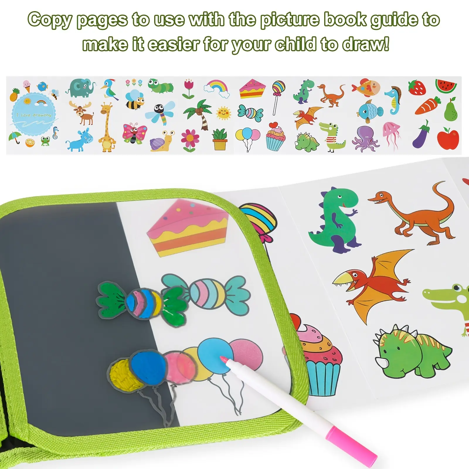 ·14 DRAWING PAGES--This kids erasable graffiti book set has 14 pages for kids to draw doodles freely, one of which is a transparent page for copying, giving kids enough room to draw. 12 watercolor pens enrich children's color world, and the accompanying copy picture book fully stimulates children's imagination.