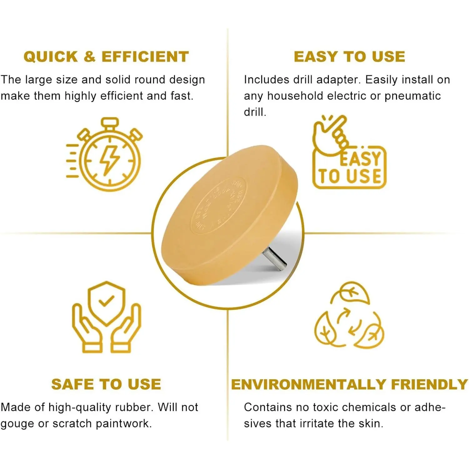 Quick and Effcient: You will receive 2 rubber wheel decal remover with a diameter of 3 2/5'' and a thickness of 0.6''.The large size and solid round design make them highly efficient and fast.They are an excellent choice for removing stickers and decals