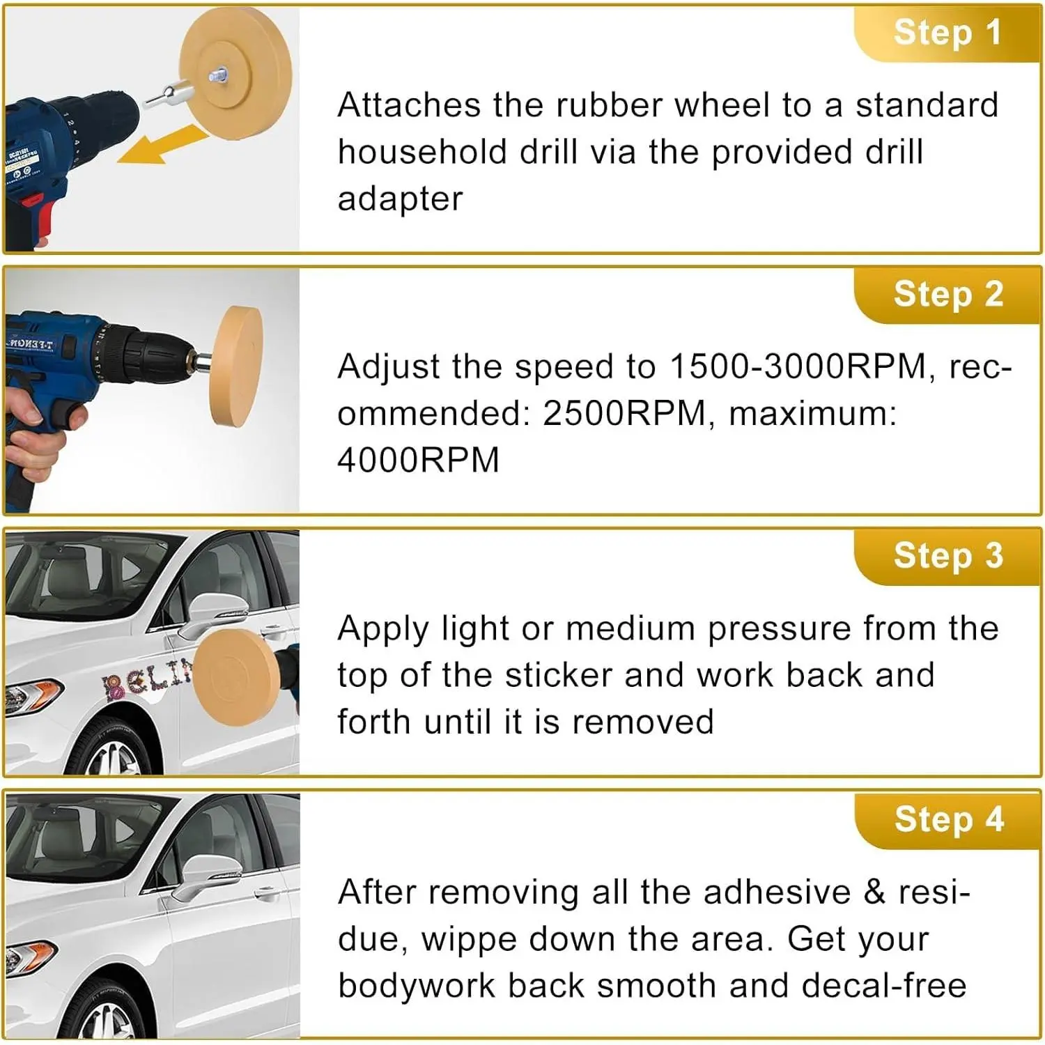 Easy to Use: the eraser wheel decal remover come with drill adapter for easy installation on any household electric or pneumatic drill.the maximum speed is 4000 rpm, and the optimal speed is 2500 rpm.apply gentle pressure from the top of the sticker and work back and forth until it is removed.then use a mild solvent to remove any residual glue and residue