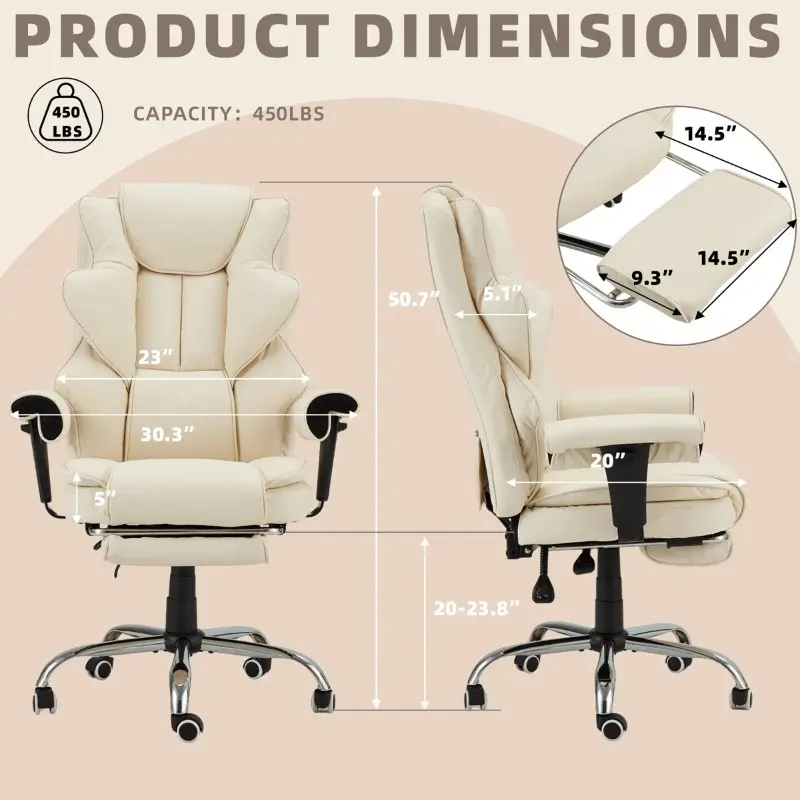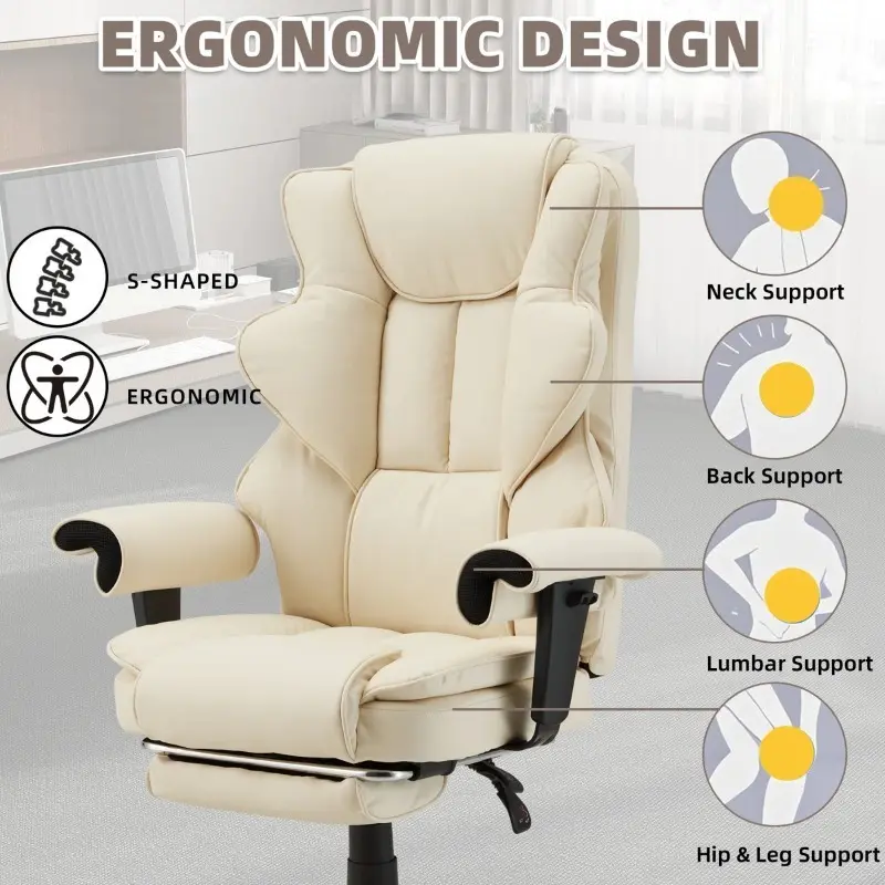 This ergonomic administrative office chair provides 5-point support for the head, neck, back, feet, and arms based on body curves. This stylish executive office chair cushion is embedded with an independent silent spring pack and 25d powder free sponge, which is both soft and supportive, and not easily deformed. Made of PU leather, scratch resistant, stain resistant, non fading, easy to clean