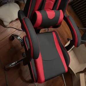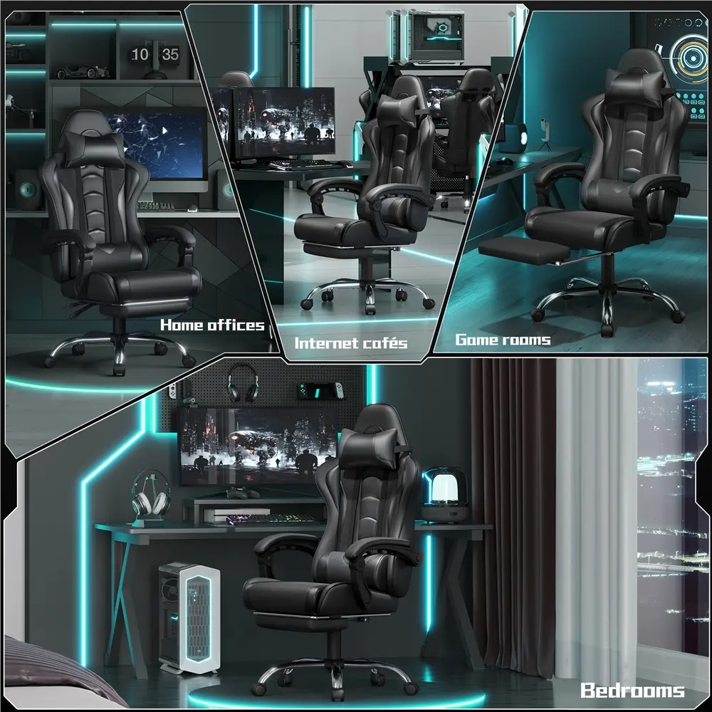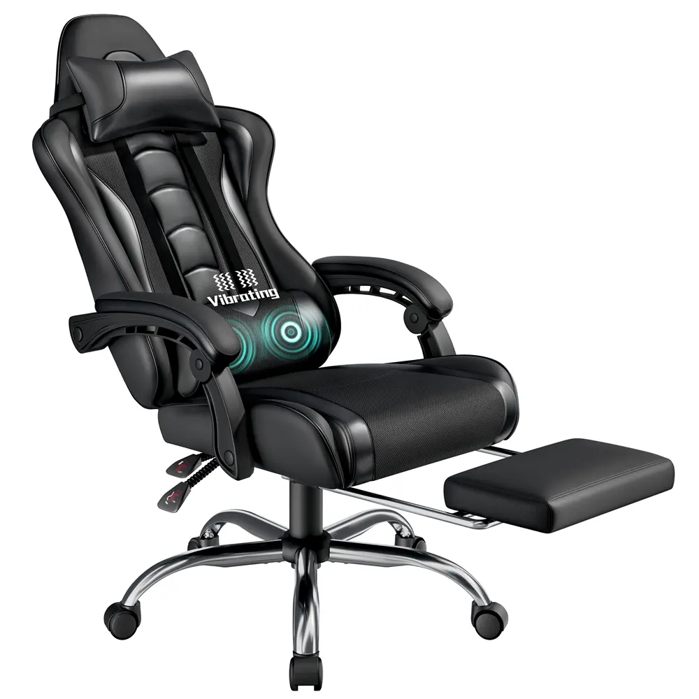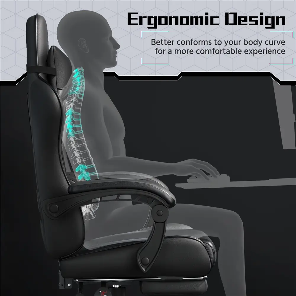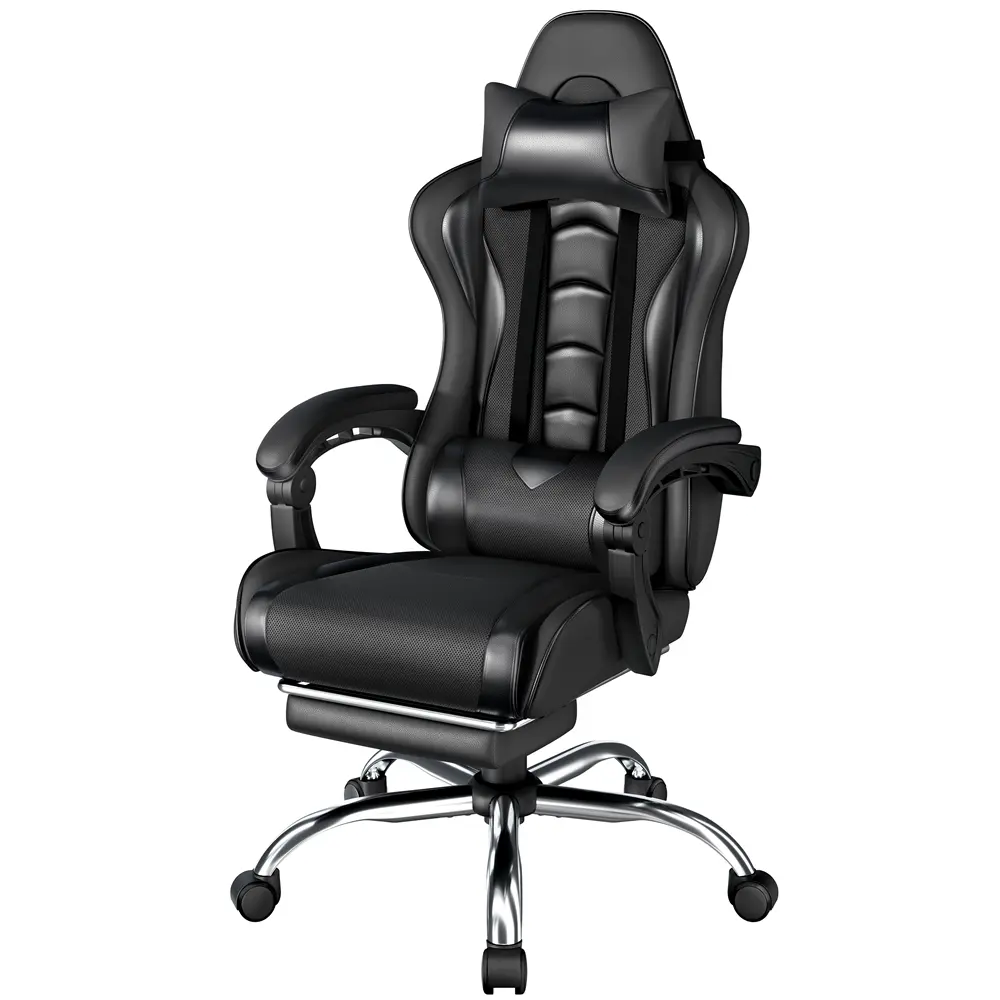 Take your gaming to the next level with this racing gaming chair with footrest. Designed for the ultimate gaming experience, this ergonomic swivel chair has everything you need to stay comfortable during long gaming sessions. Adjust the seat height, recline up to 135 degrees and extend the footrest for maximum relaxation. Plus, the desk chair includes a removable head pillow, a massage lumbar pillow, and padded armrests for extra support. The mute castors and wide metal base ensure a safe and stable gaming experience. With a classic color scheme and racing seat-inspired design, this faux leather gaming chair is not just for the game room - it's fantastic for your home office, bedroom, study, dorm room and more.