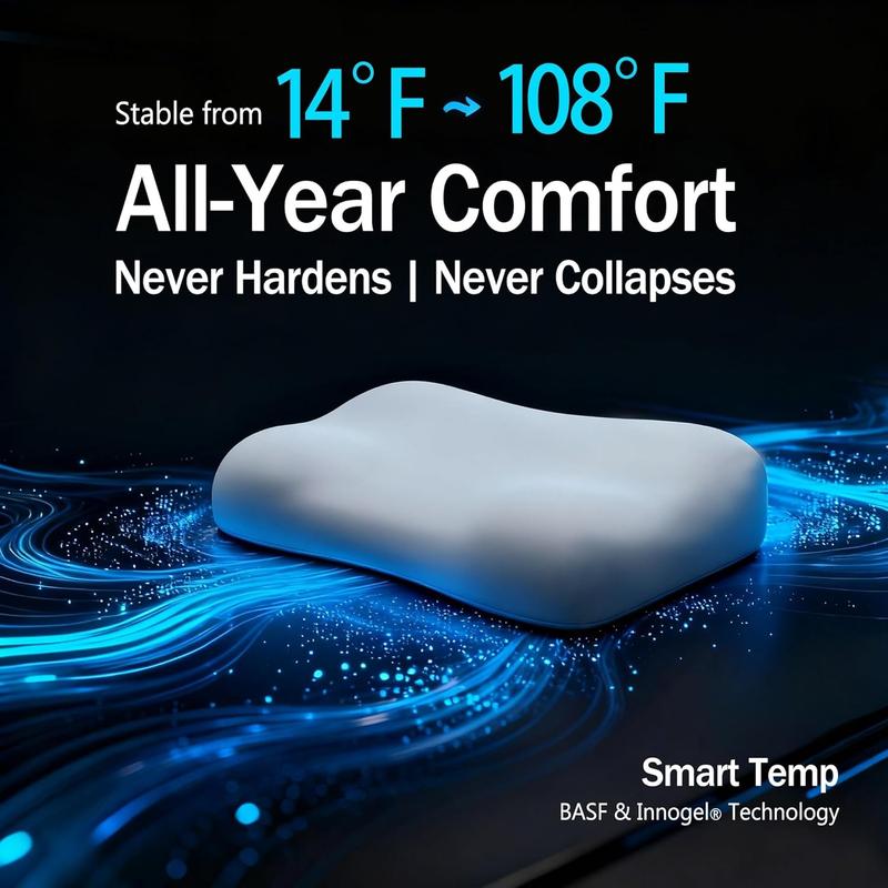 ·SMART TEMPERATURE-REGULATING PILLOW:ALL-SEASON SUPPORT & NECK PAIN RELIEF | Experience all-night comfort in any season with our Innogel technology cooling pillow.Engineered with BASF's temperature-responsive gel,it maintains structural stability in extreme temperatures 14°F to 108°F-never hardening in winter or collapsing in summer.The smart surface actively absorbs heat upon contact, delivering instant cooling softness that cushions your head and neck. When you move, it releases heat and rebounds to optimal support, creating continuous temperature regulation throughout the night. Millions of breathable micro-pores promote airflow to wick away humidity, maintaining ideal sleeping climate.