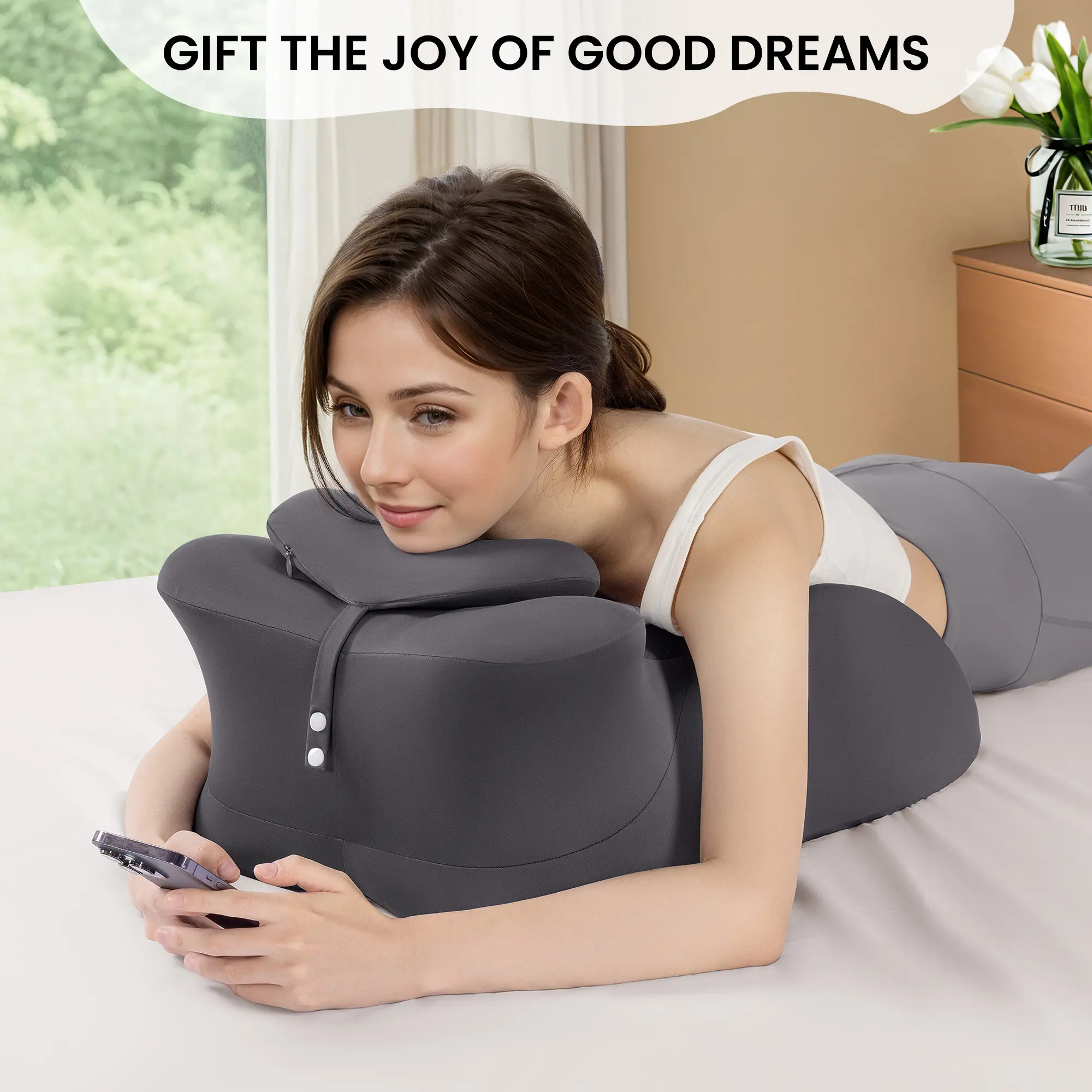 Specially designed for face-down comfort while reading, watching videos or browsing your phone. Maintains proper spinal alignment and reduces pressure on your arms and shoulders - say goodbye to neck strain!