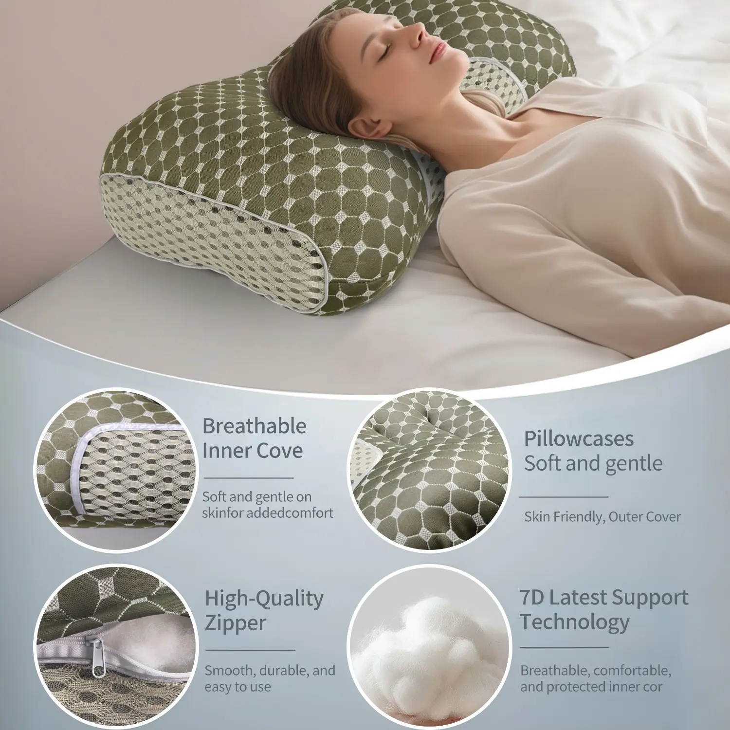 Crafted with a skin-friendly, hypoallergenic fabric that’s gentle even on sensitive skin. The top surface uses a smooth, breathable plain knit for softness you can feel, while the sides feature an airy crochet weave for enhanced airflow. Together, they keep you cool, dry, and comfortably supported throughout the night.