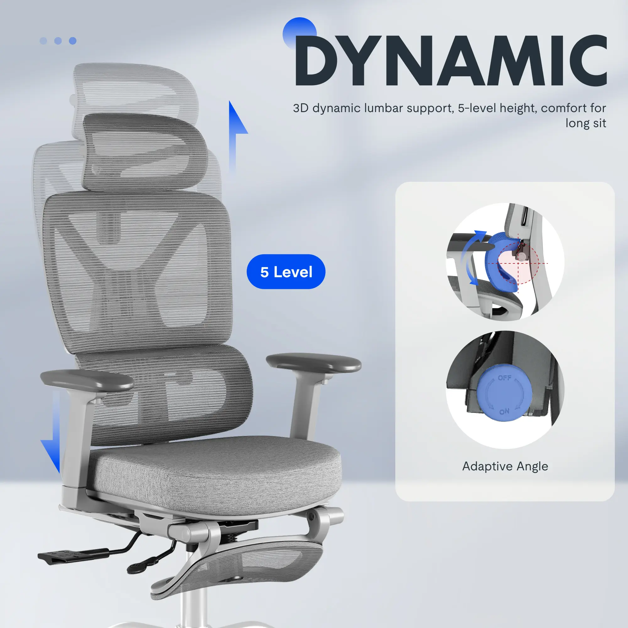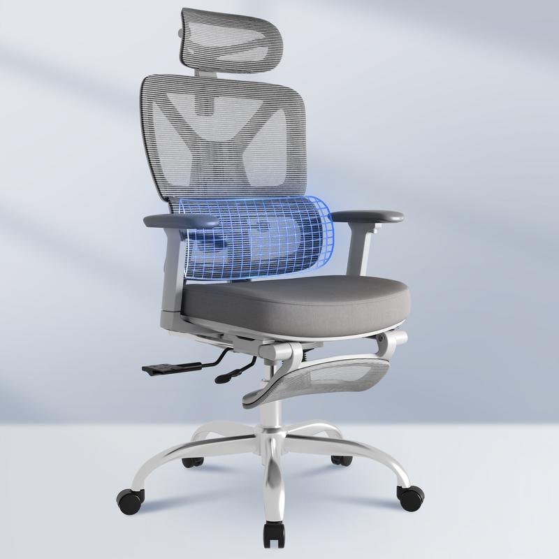 ·【Dynamic Lumbar & Full Back Support】Enjoy continuous comfort with dynamic lumbar support, a 5-level adjustable backrest, and a 3D headrest that adapts to your posture. The reclining and tilt mechanism relieves back tension during long work sessions.