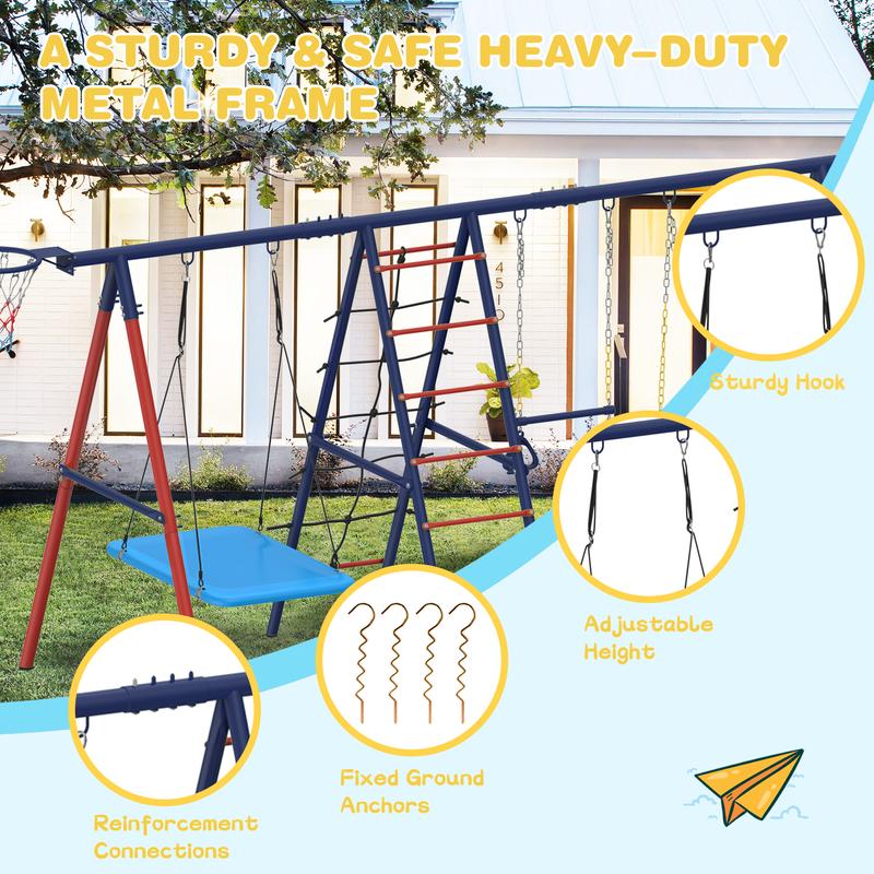 Crafted with a weather-resistant metal frame and a powder-coated finish, our outdoor playset can handle sun, rain, snow, and wind—ensuring long-lasting use. The sturdy frame supports up to 440 lbs, making it perfect for kids of different ages to play together safely. Plus, the reinforced connections, fixed ground anchors, and adjustable swing heights offer enhanced stability and security.
