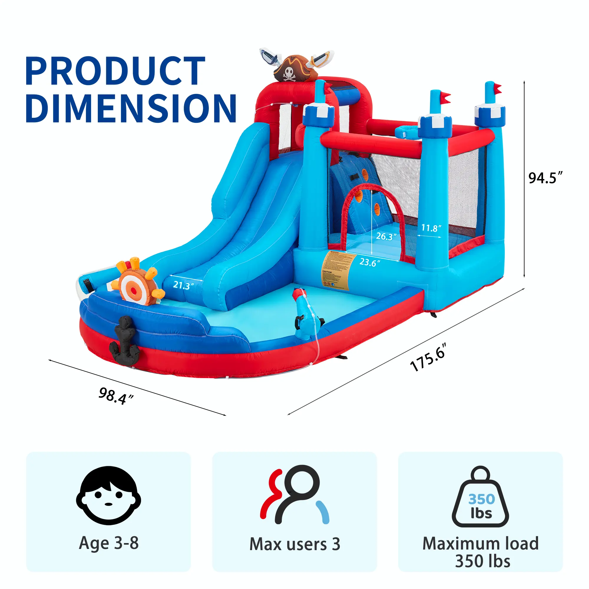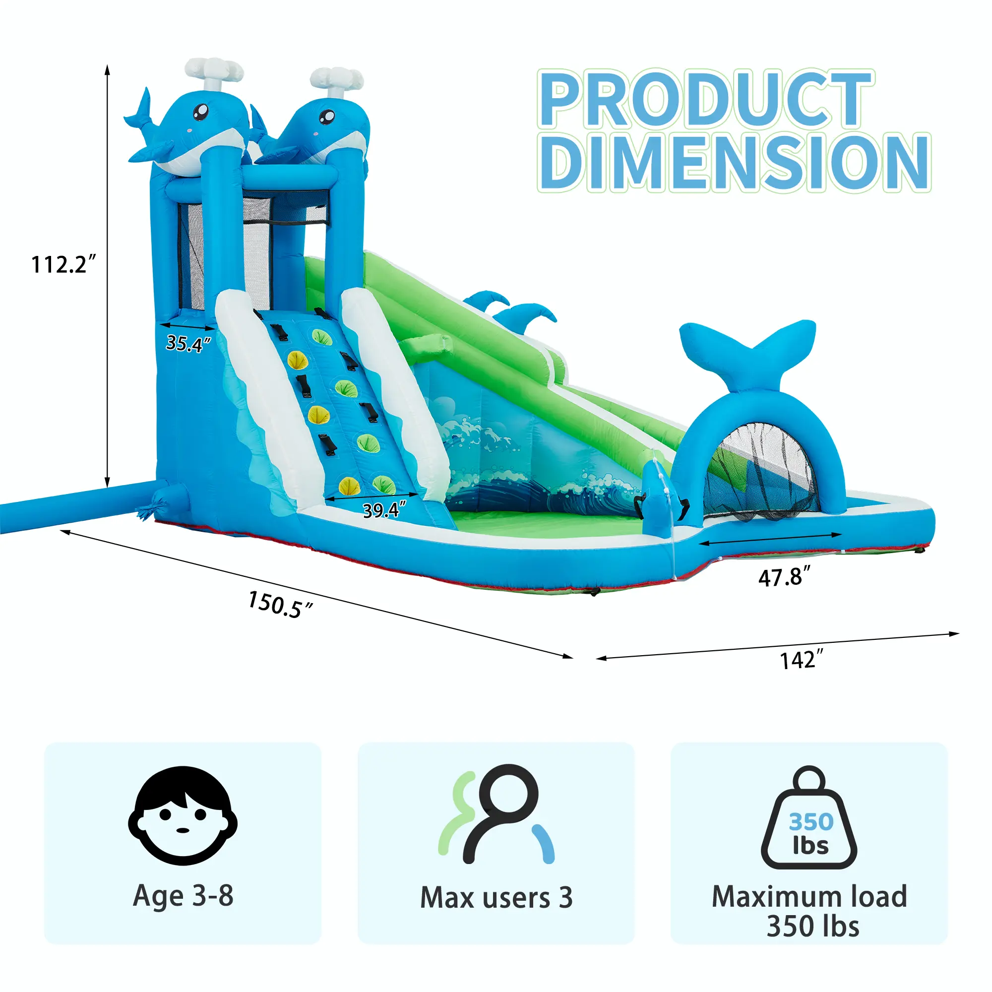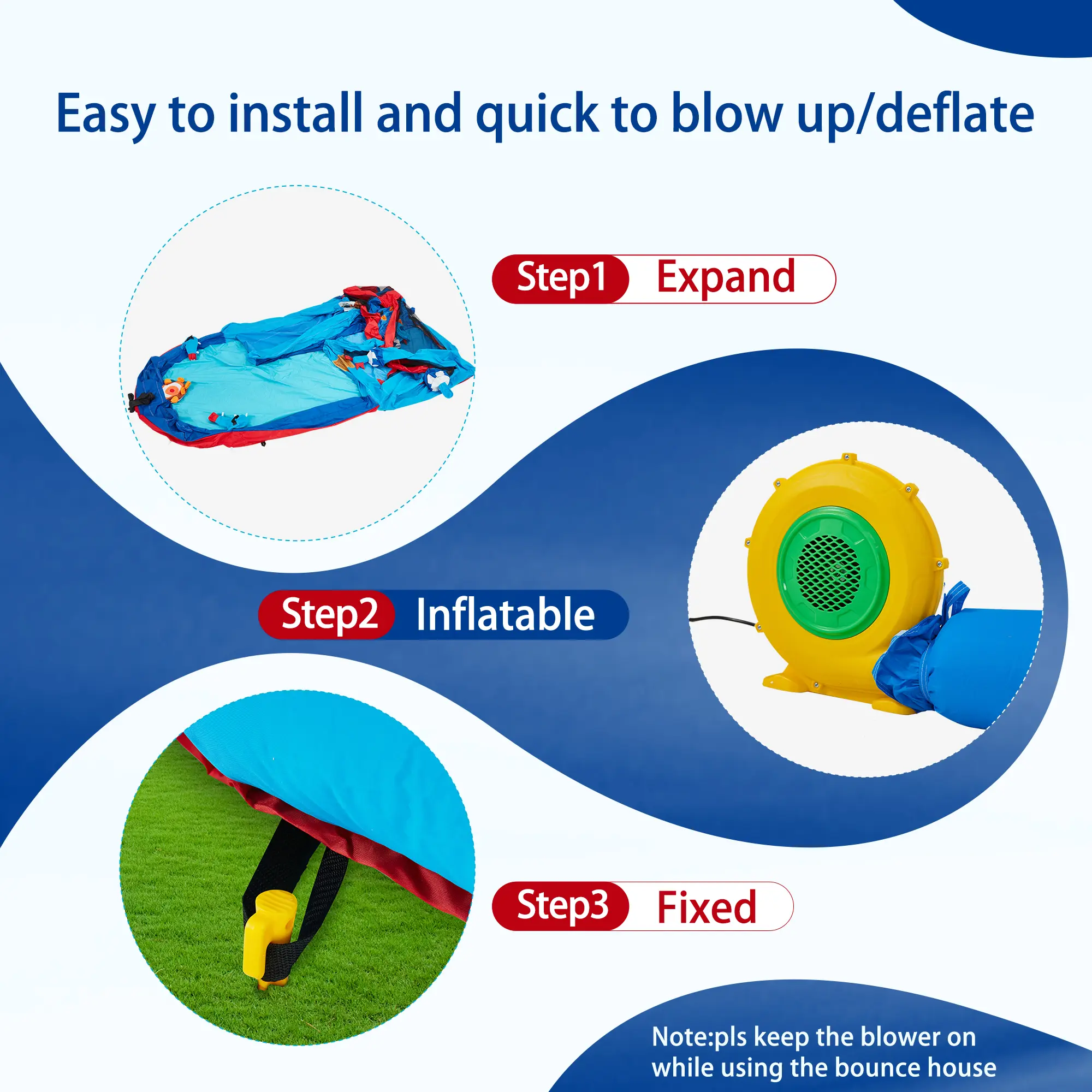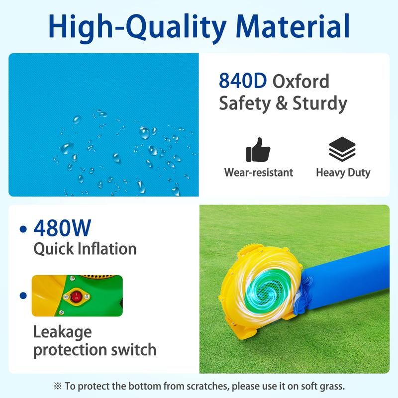Efficient Inflation: With a 480W electric blower, this water slide bounce house can be inflated to full in less than a minute. There are two inflatable ports, one long and one short, both with elastic bands, making the inflation process more worry-free. Please keep the blower turned on during use to maintain the supporting force. There will be slight air leakage at the seams of the product during use, for safety reasons. For further safety protection, an adult is required to complete the installation before each use.