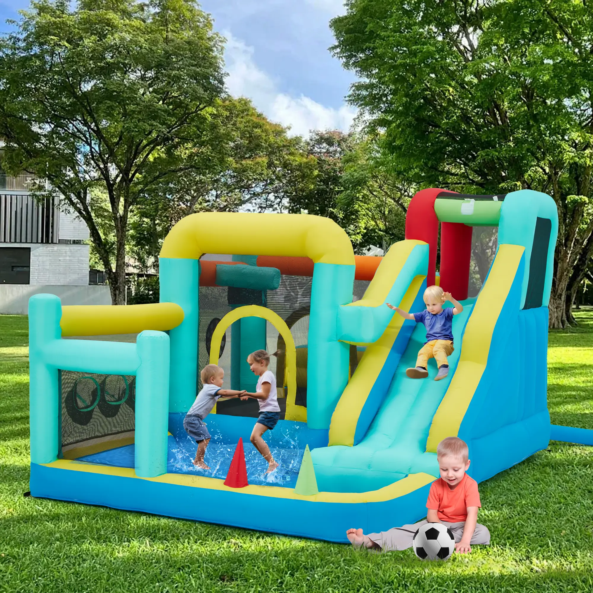 Wider Functions:The inflatable water slide can be set up for various occasions such as family gatherings in the backyard, activities in children's parks, and birthday celebrations. The water slide bounce house offers a great space for safe and wonderful entertainment, where kids can have outdoor fun just a few steps away from home. It commands attention during birthday parties and makes them full of joy. It remains in good condition while placed on soft grass; the grass acts as a cushion, absorbing friction from the ground thus protecting the bottom.