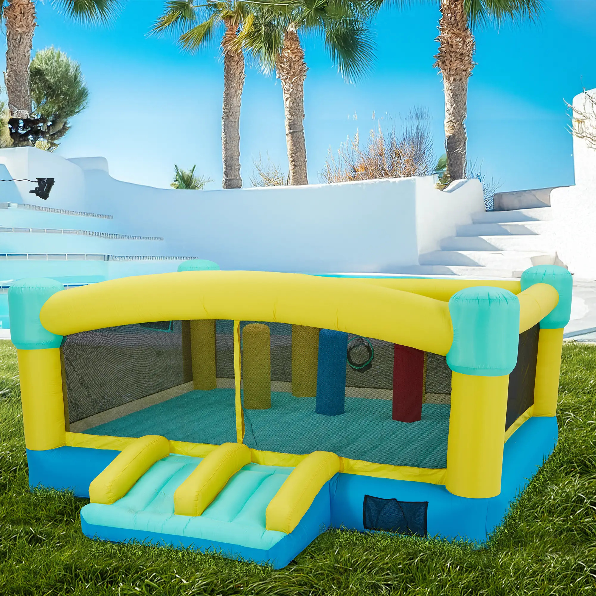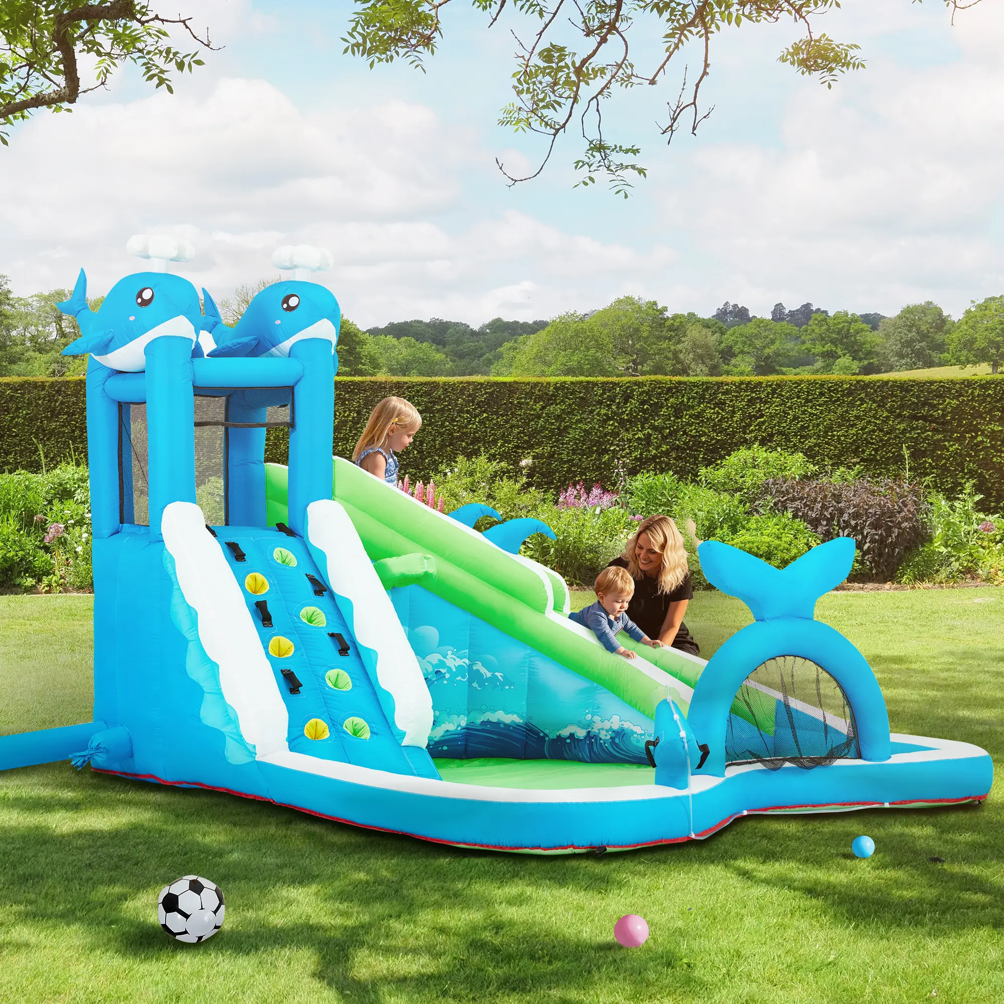 Diverse Entertainment Options:There are multiple activities in this bounce house with a unique mermaid shape for children to enjoy. Children gain courage and strength by volleyball matches, which is thrilling and an exercise in pushing themselves physically and mentally. The trampoline area can help to cultivate children's bouncing ability. In addition, there will be cool water slides and water-gun-fighting zones that are just perfect for summer fun.