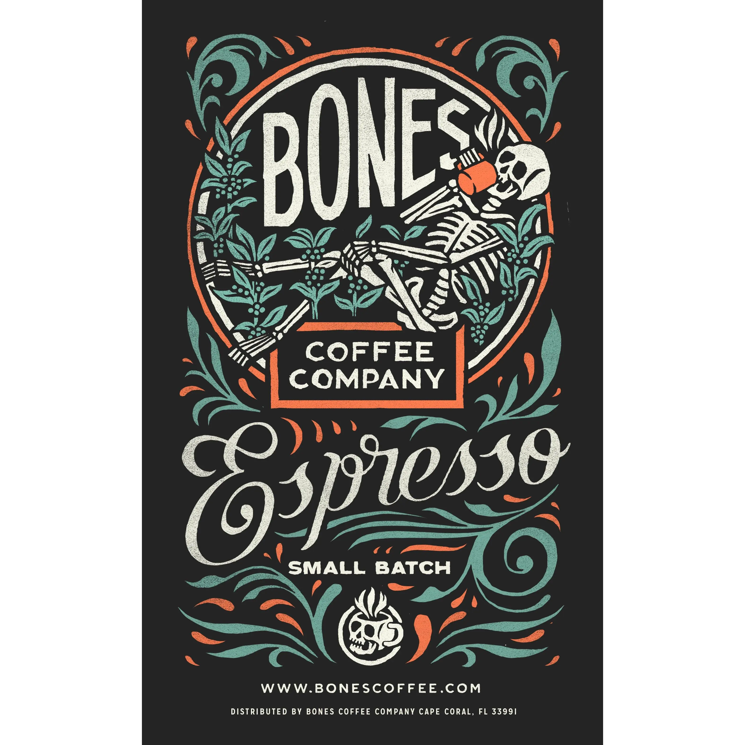 Bones Coffee's Espresso is a blend of South-Central American beans that yields a full-bodied and robust espresso with low acidity and slight hints of citrus & cocoa.