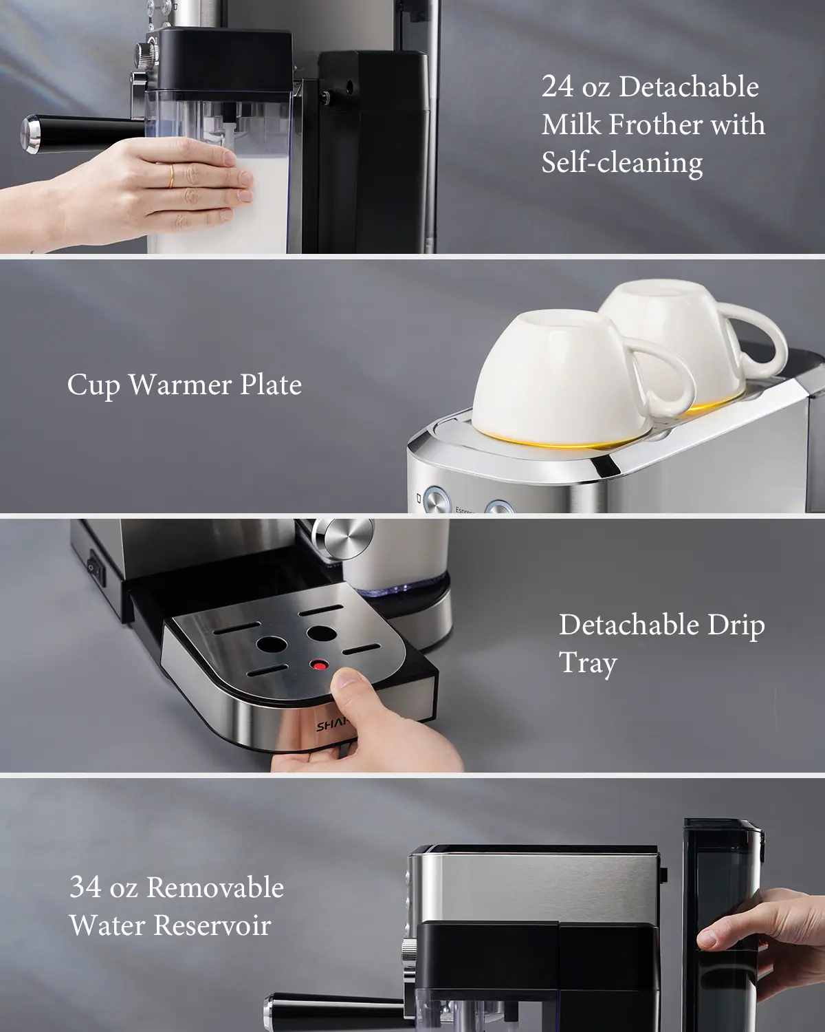·[ STYLISH & USER-FRIENDLY DESIGN ] - The elegant espresso machine is perfect for your kitchen. The drip tray is detachable and can accommodate various mug and cup sizes. Additionally, it is removable for easy cleaning and maintenance. The machine also features a heated metallic plate on top to keep your cups warm, ensuring that the coffee flavor is not affected by cold surfaces.