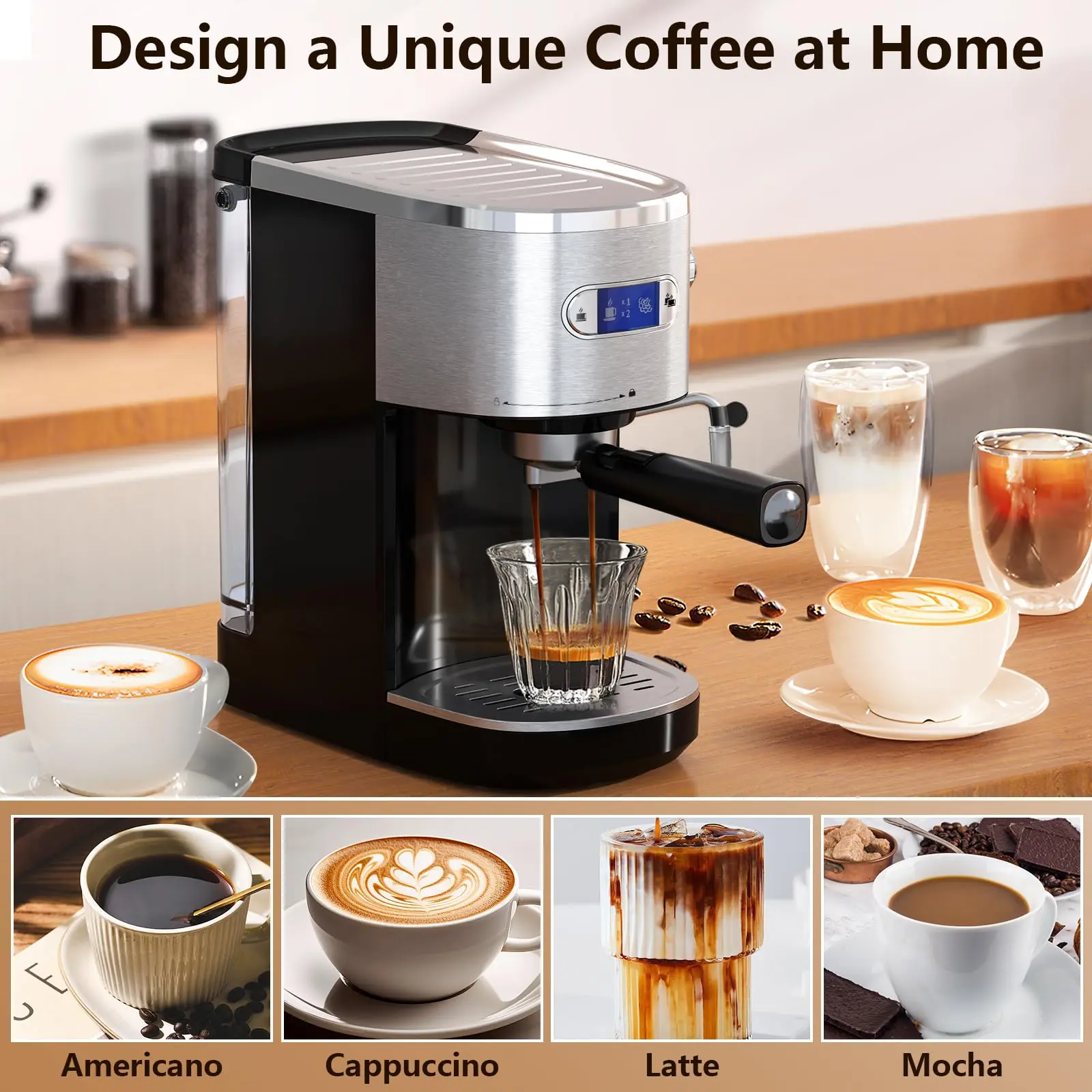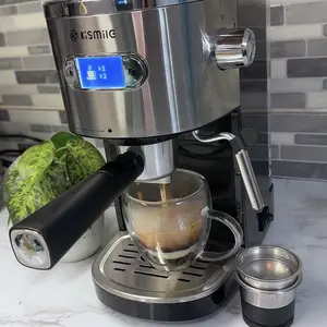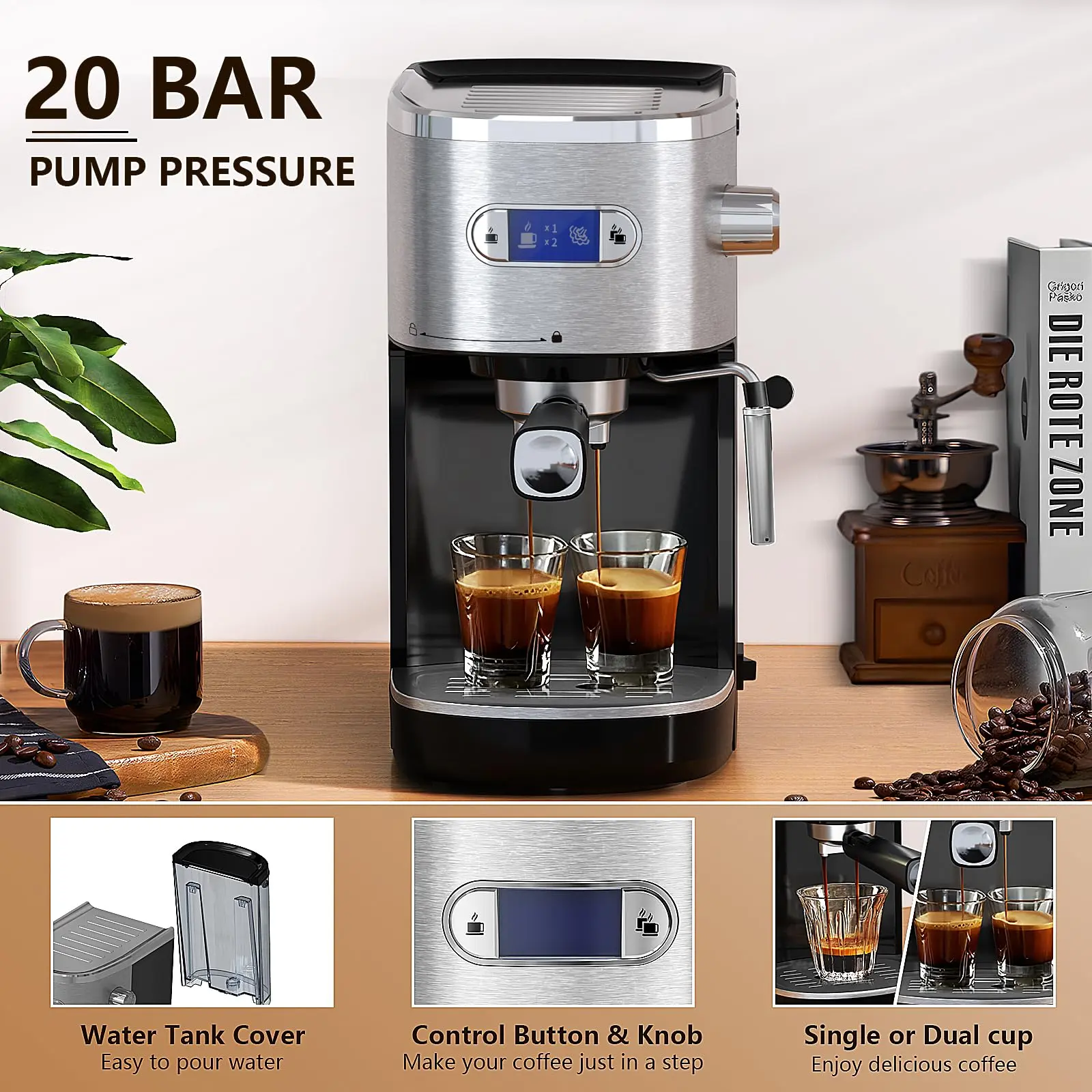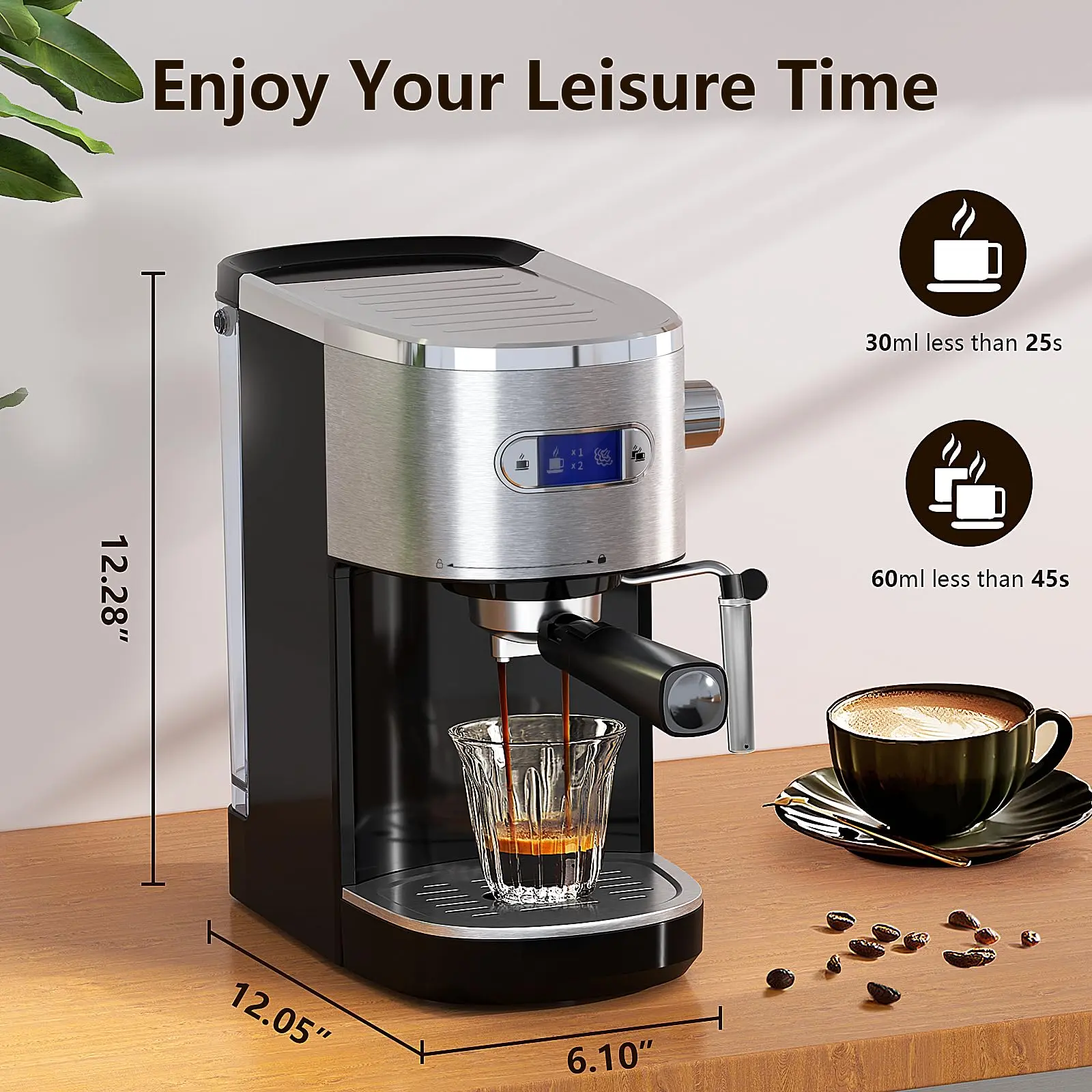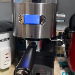 ·【LCD display】 This coffee machine is equipped with a blue LCD display that can clearly display the coffee making process. Turn on the black button on the side to turn on the machine, press the single or double cup button to keep the machine stable, and then produce coffee in less than 25 25s/cup.