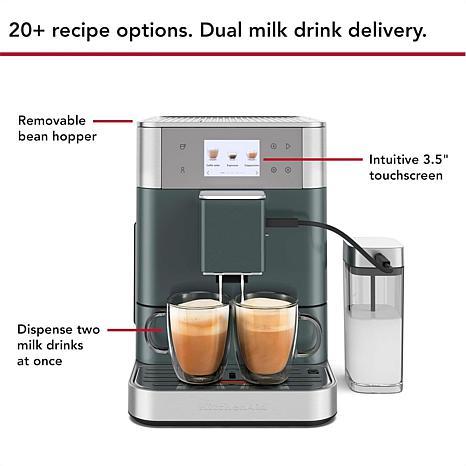KitchenAid Fully Automatic Espresso Machine Enjoy all of your favorite espresso beverages at home with the push of a button. Personalize and store your own recipes based on strength, length and temperature for premium handcrafted, quality espresso made to fit your taste. What You Get (1) Fully automatic espresso machine (1) 2.2 L Water tank (1) Water filter (1) Bean hopper (removable) (1) Milk container (1) Milk tube (2) Caning tablets (brew unit) (1) Spoon (filter mounting aid) (1) Water hardness test strip