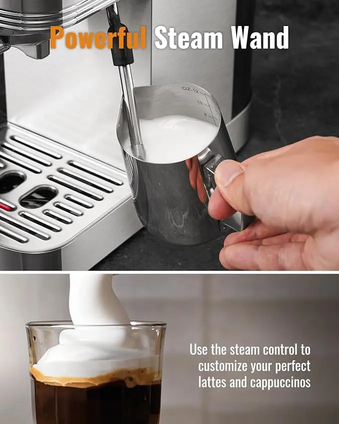 Professional Steam Wand: Our espresso machine with a milk frother has a powerful steam wand that creates creamy, rich foam for better coffee flavor and latte art. Ideal for lattes, cappuccinos, and macchiatos, this compact machine helps you make barista-quality drinks at home.