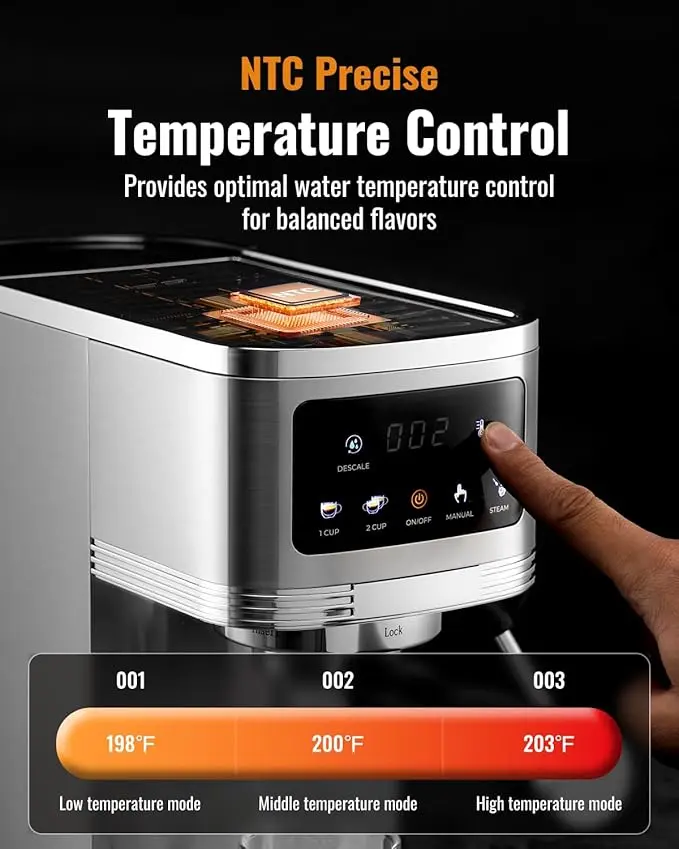 NTC Precision Temperature Control: With three temperature settings, you can fully control your coffee experience by adjusting the extraction temperature to suit your taste.