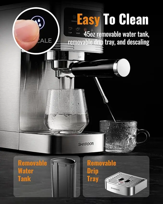 Compact Stainless Steel Design: This espresso machine fits perfectly in any kitchen. The 45 oz removable water tank lets you brew several cups without refilling, and the drip tray is easy to clean. Includes everything you need to get started: Espresso Machine, 45 oz Water Tank, Single & Double Cup Filters, Portafilter, Tamper with Spoon, and Instruction Manual.