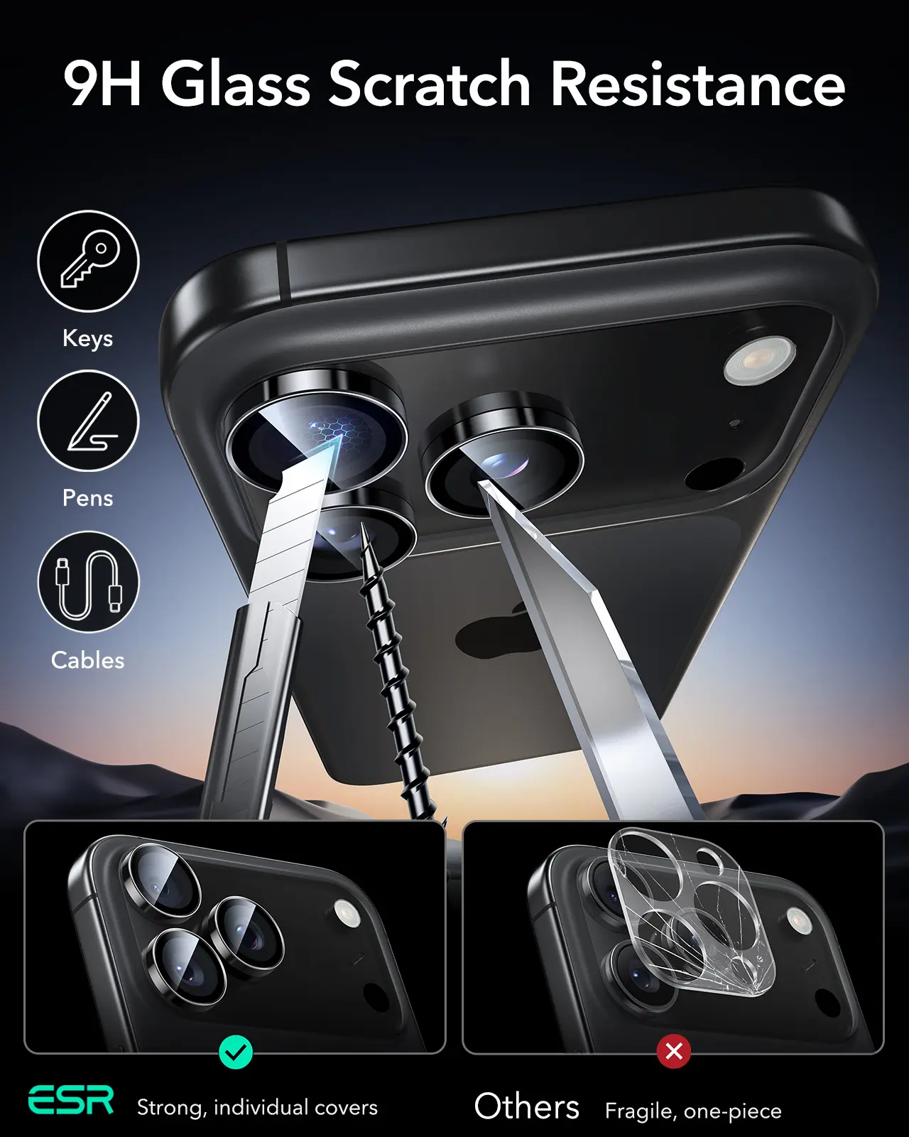 eguard your iPhone's camera lenses with the ESR Camera Lens Protector. Compatible with iPhone 17 Pro Max, 17 Pro, 16 Pro Max, 16 Pro, 15 Pro Max, 15 Pro, 14 Pro Max, 14 Pro. This ultra-tough HD protector offers individual lens protection. It's scratch-resistant and ultra-thin, ensuring your camera stays pristine.