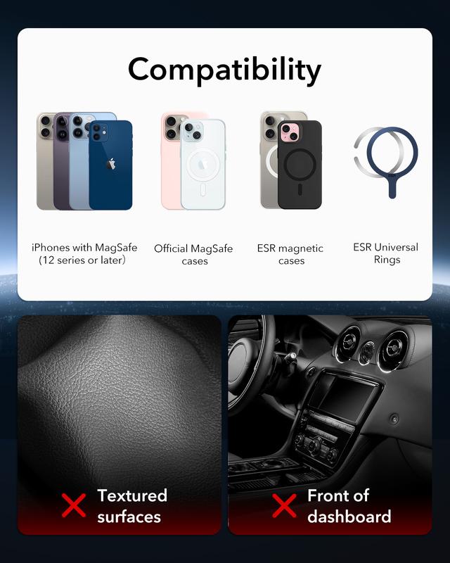 ·Strong Magnetic Lock: ultra-strong magnets with a holding force of 2,300 g keep your phone securely in place, even over bumpy roads; only compatible with iPhone 15/14/13/12 series phones