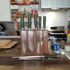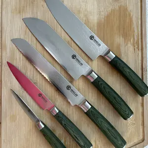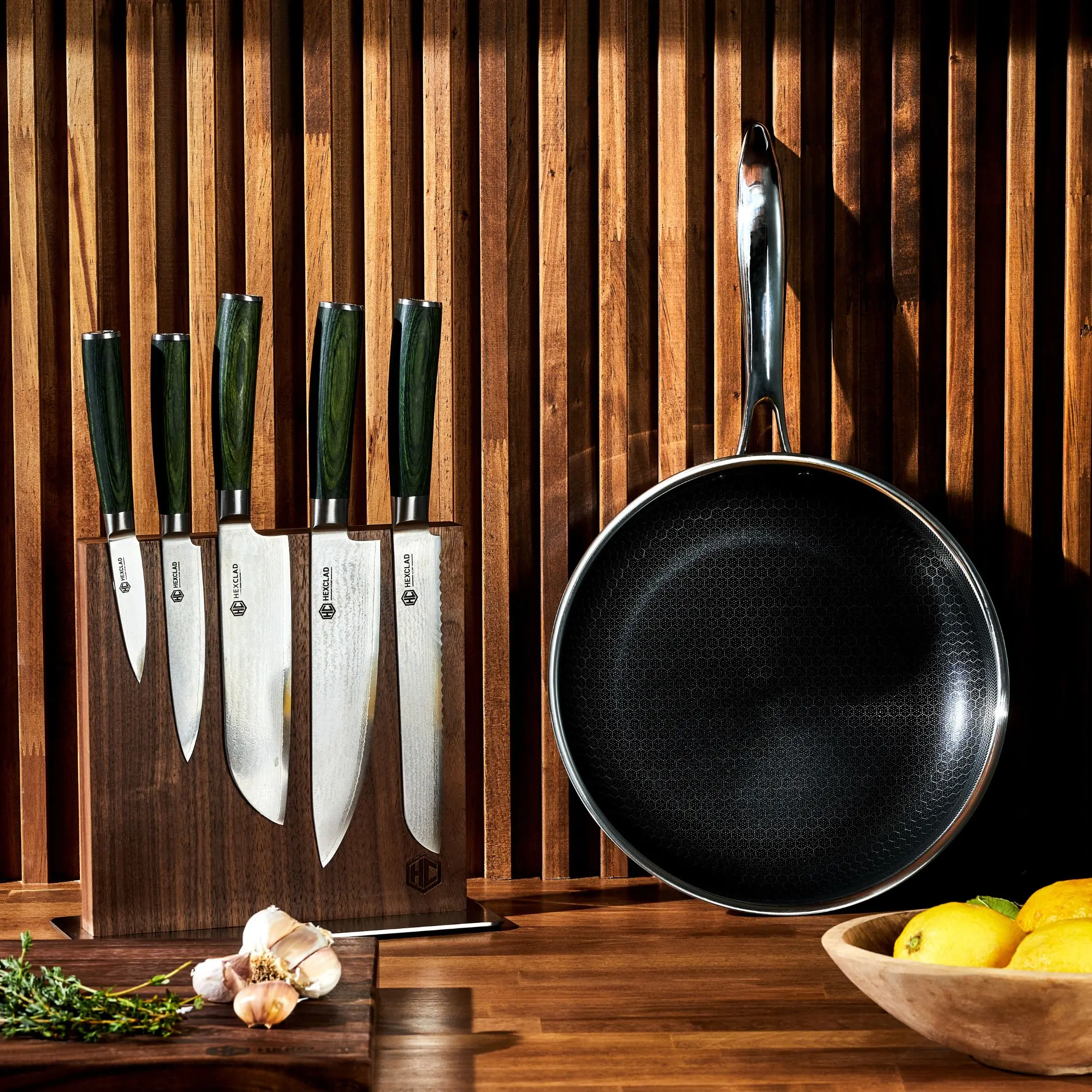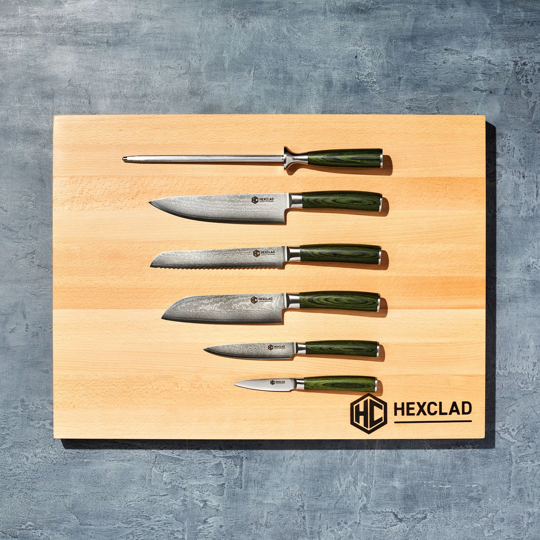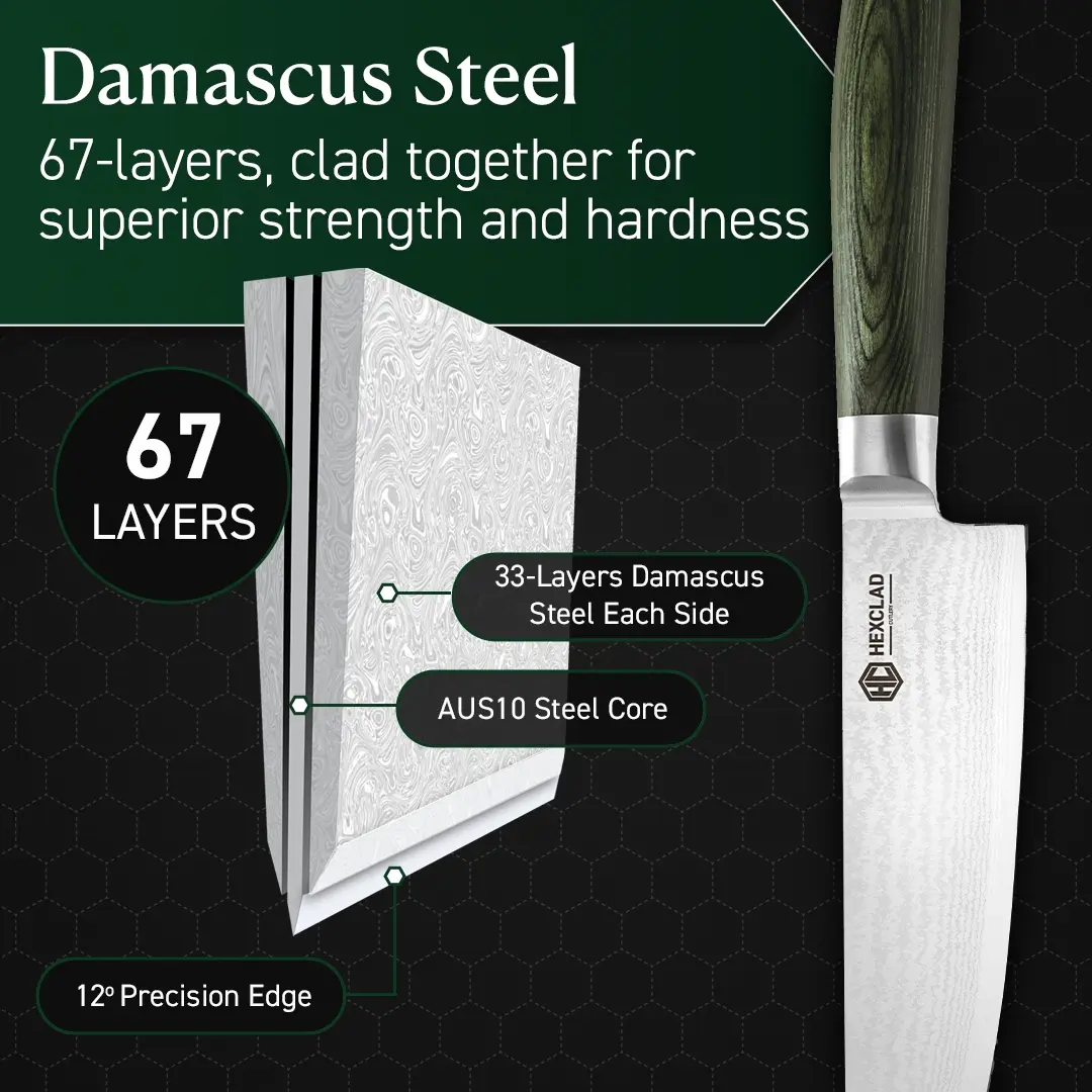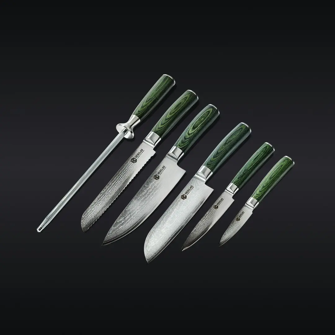 This 6-piece knife set has everything you need to dominate food prep. Each knife is forged from 67 layers of Japanese Damascus steel, giving you a harder blade and a sharper edge for effortless slicing, as well as superior durability and balance. Plus, the striking Damascus wave pattern and rare forest green Pakkawood handles make a statement in any kitchen.