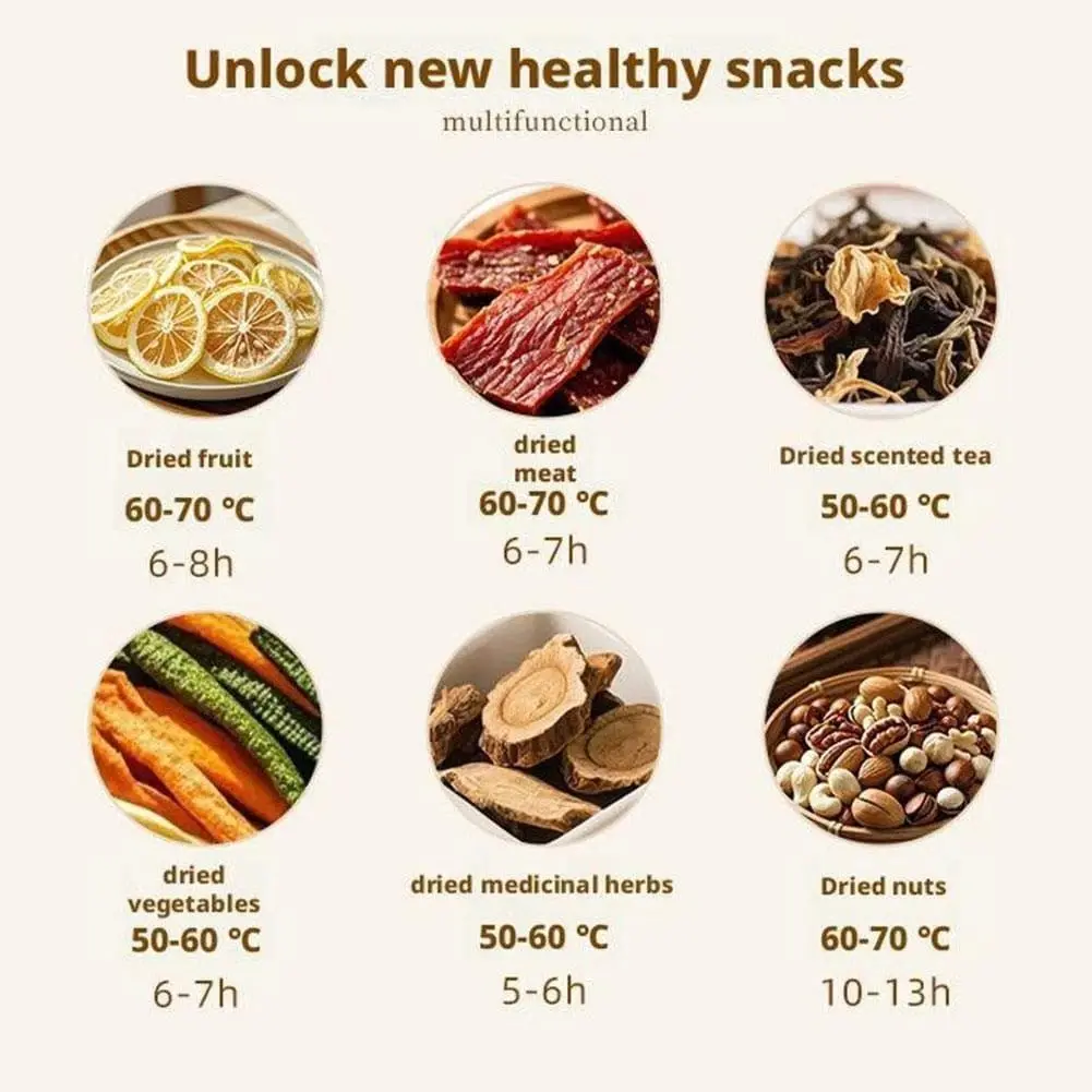 5 LAYERS OF TRAYS - This food dehydrator is designed with 5 large capacity food-grade drying racks, which is enough to hold most food items and create uniform drying; 5 trays provide the ultimate convenience to classify different food and increase productivity; The stackable trays can be rotated together 180 degrees for different heights 5 to accommodate foods of varying sizes and thicknesses; Make whatever jerky or fruit you want