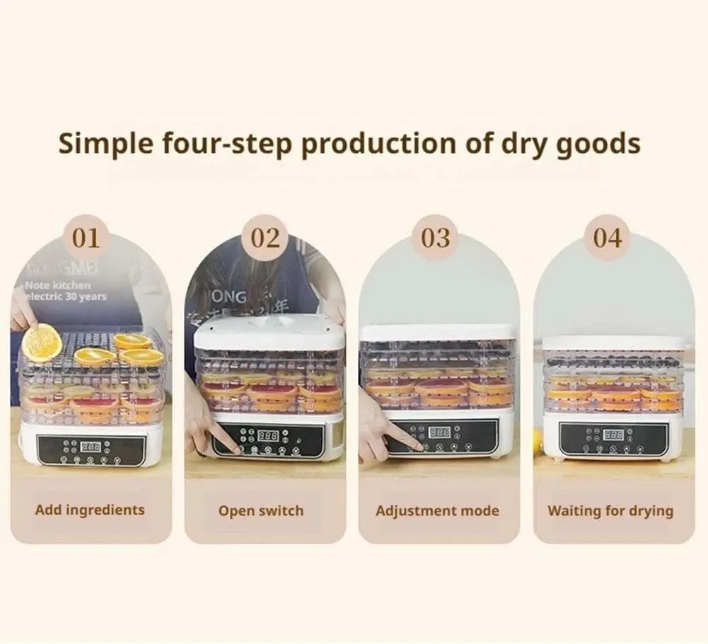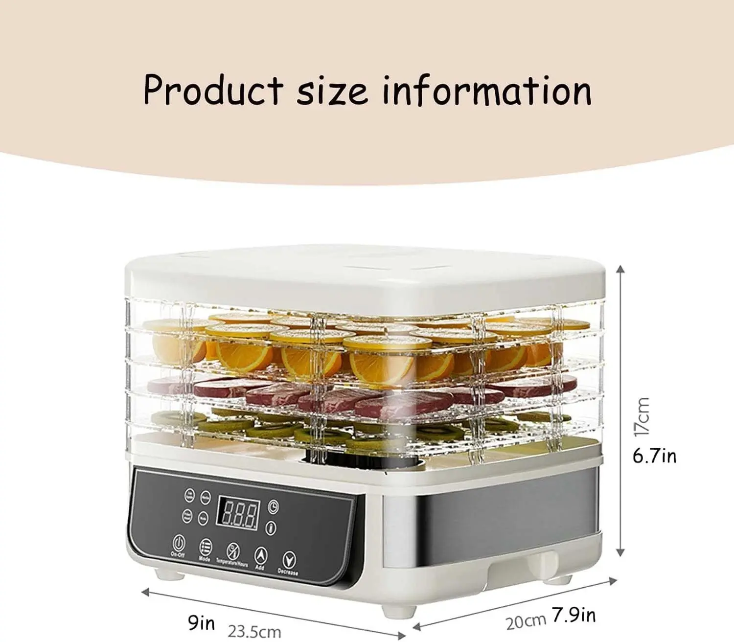 PREMIUM MATERIAL - Made of a stainless-steel base and premium plastic trays, all the materials are free of BPA, and are absolutely safe for your health; The digital LED display screen allows you to accurately time and control temperature settings; The fine-meshed plastic sheet for drying small food like herbs while silicon tong helps you take up and place food more conveniently; Enjoy an easy, healthy homemade snack without any additives