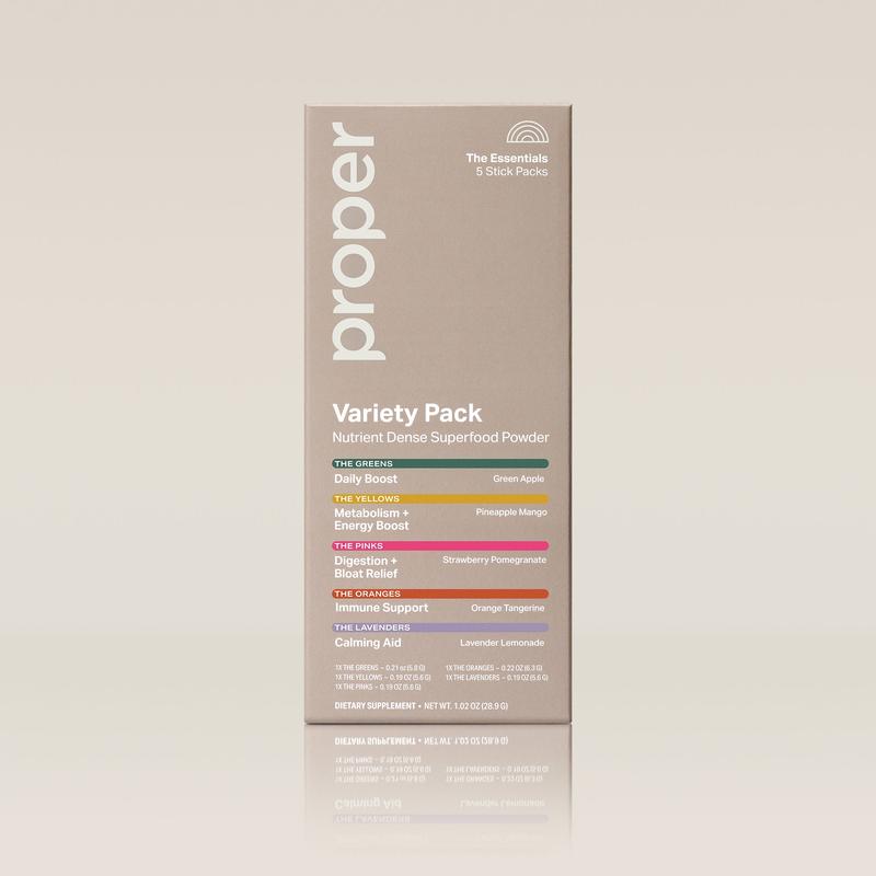 Discover your favorite Proper blend with this 5-count variety pack: Made of antioxidant-rich superfoods, essential vitamins, vital minerals, and whole-food-derived ingredients, each convenient stick is formulated to support overall wellness and vitality. Take them anywhere—just add water. (Includes 1 stick pack per flavor.)