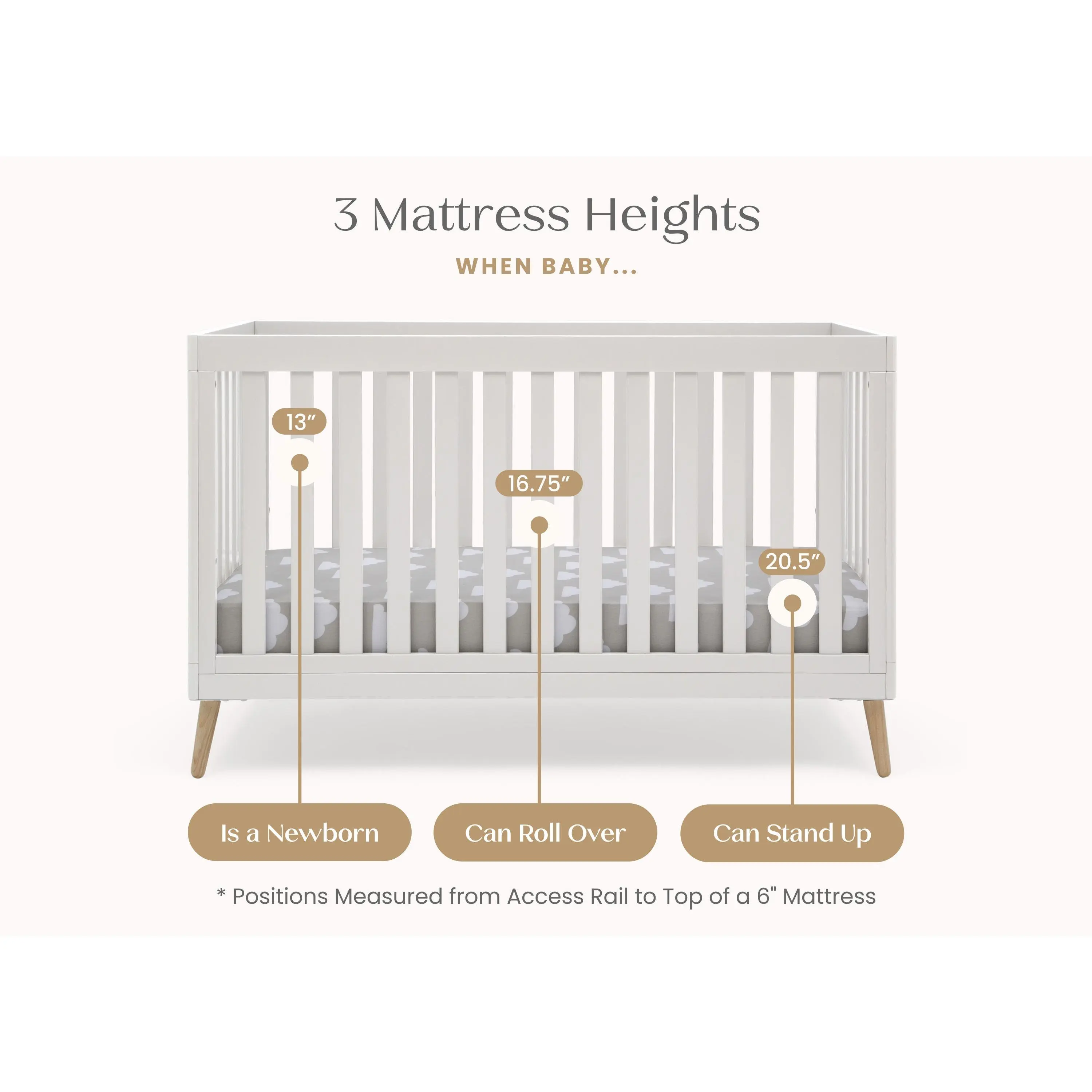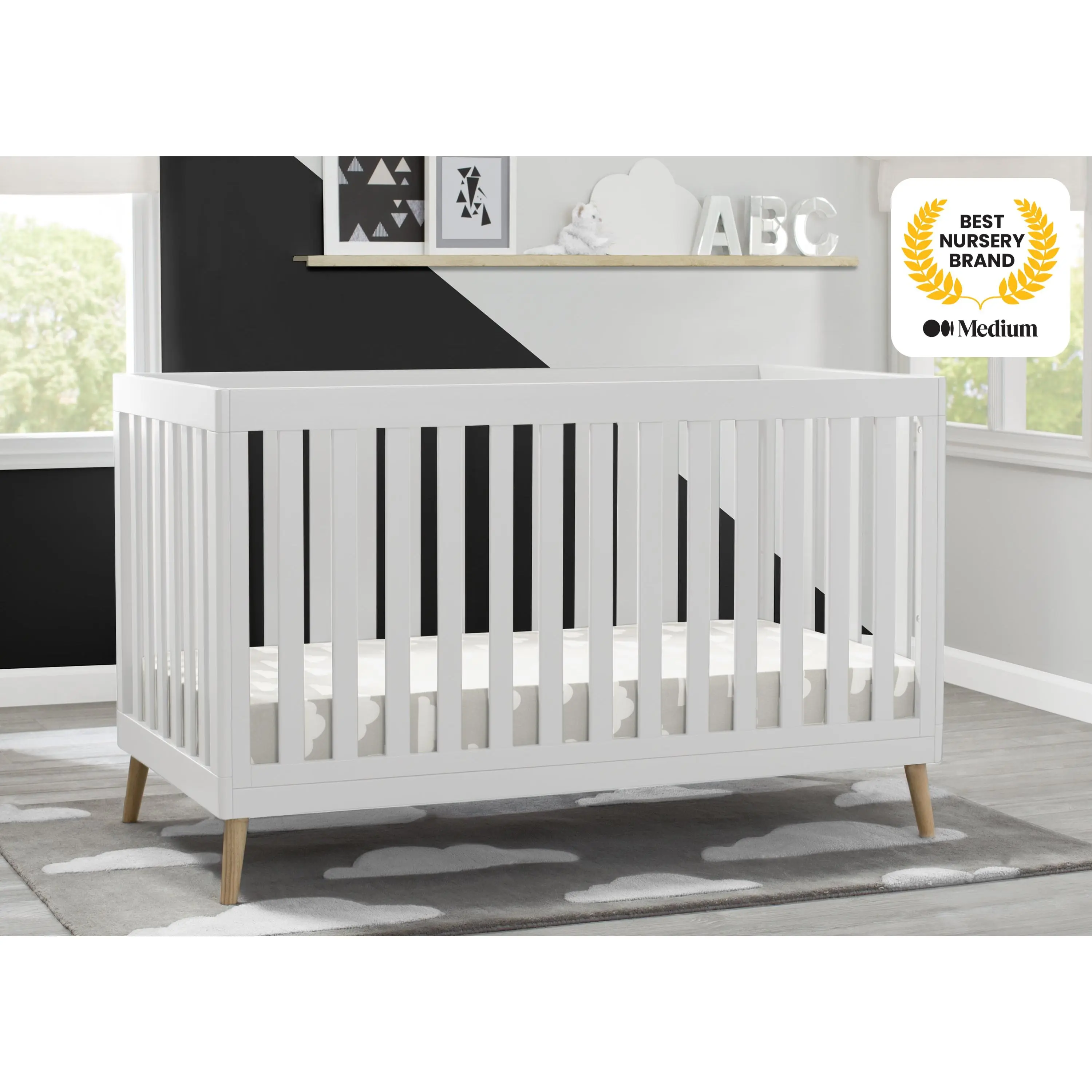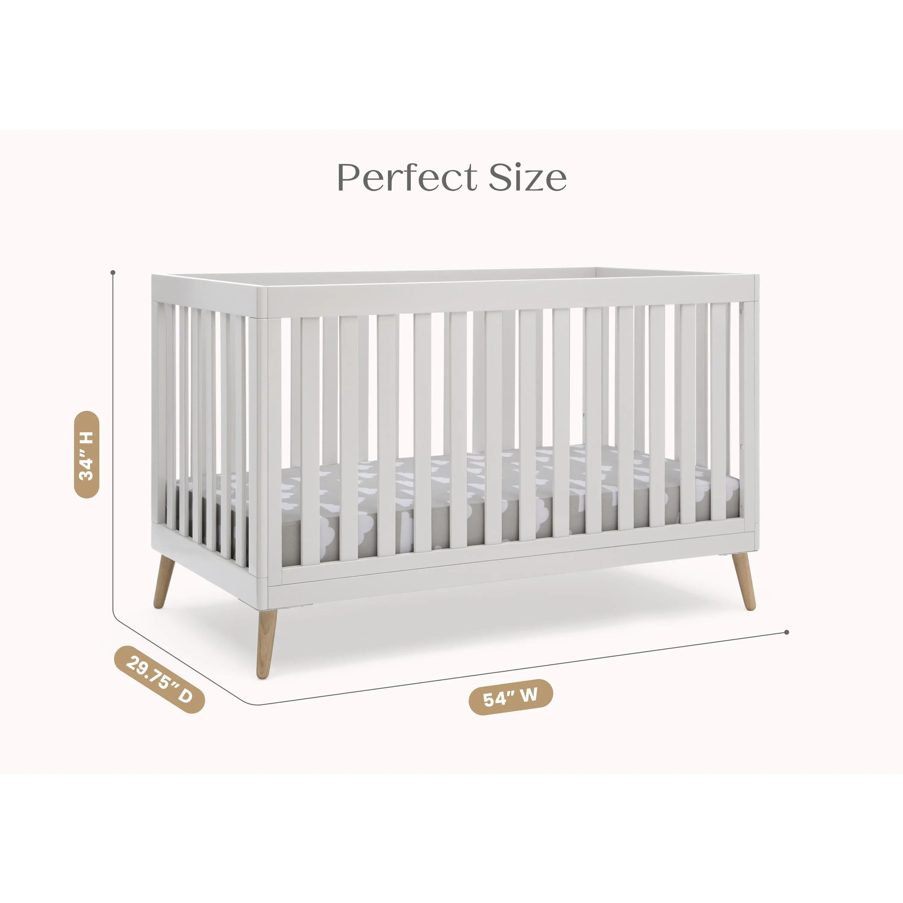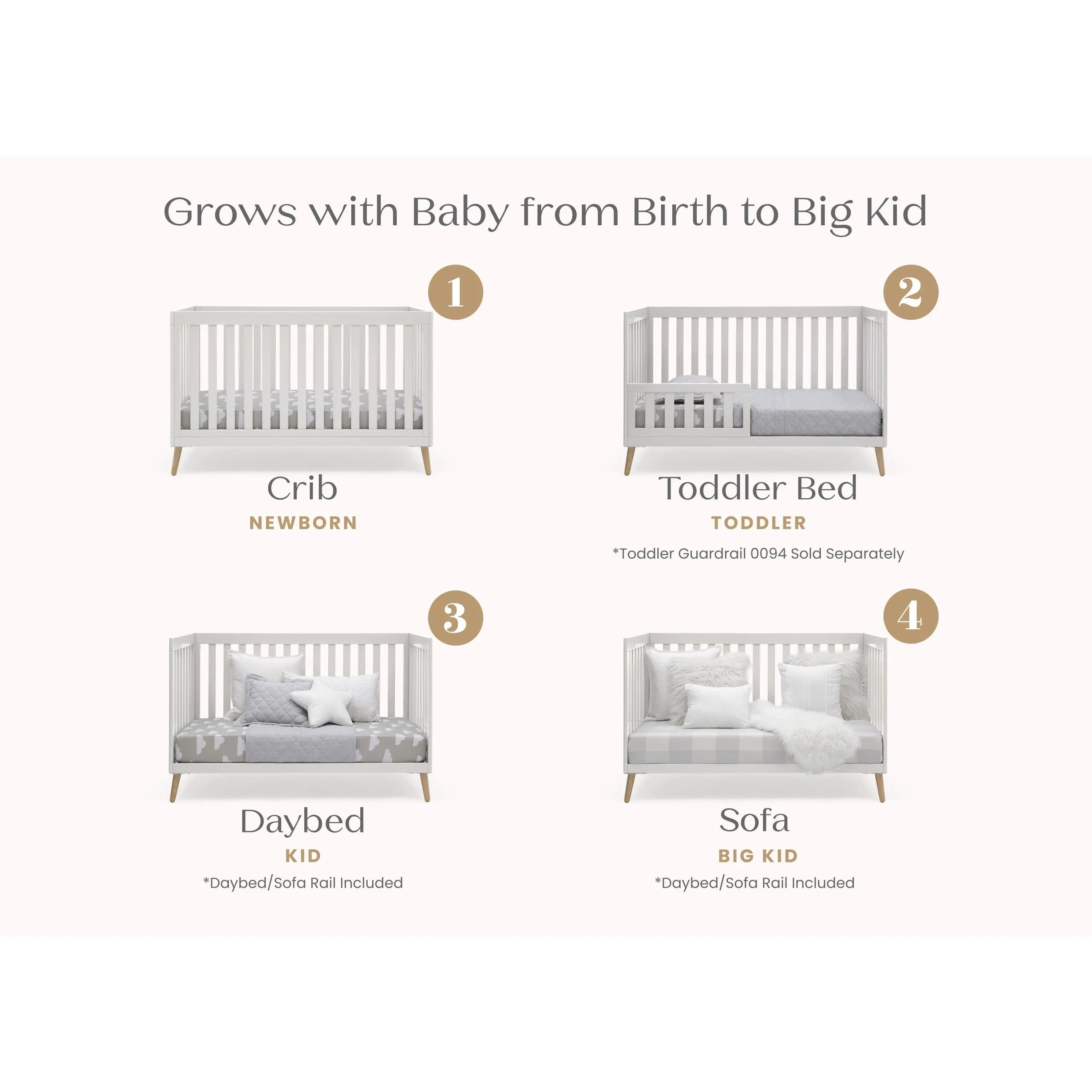 The Essex 4-in-1 Convertible Baby Crib by Delta Children is designed to elevate modern nurseries. It features gently curved corners and splayed feet in a natural finish for some retro cool contrast. The adjustable height mattress allows this crib to grow alongside your little one—start with the mattress at the highest level, then lower it as your baby begins to sit or stand. Once your child outgrows the crib, convert it to a toddler bed, daybed or sofa. To complete your mid-century modern nursery, pair the Essex 4-in-1 Crib with the Essex Changing Table/Bookcase by Delta Children.