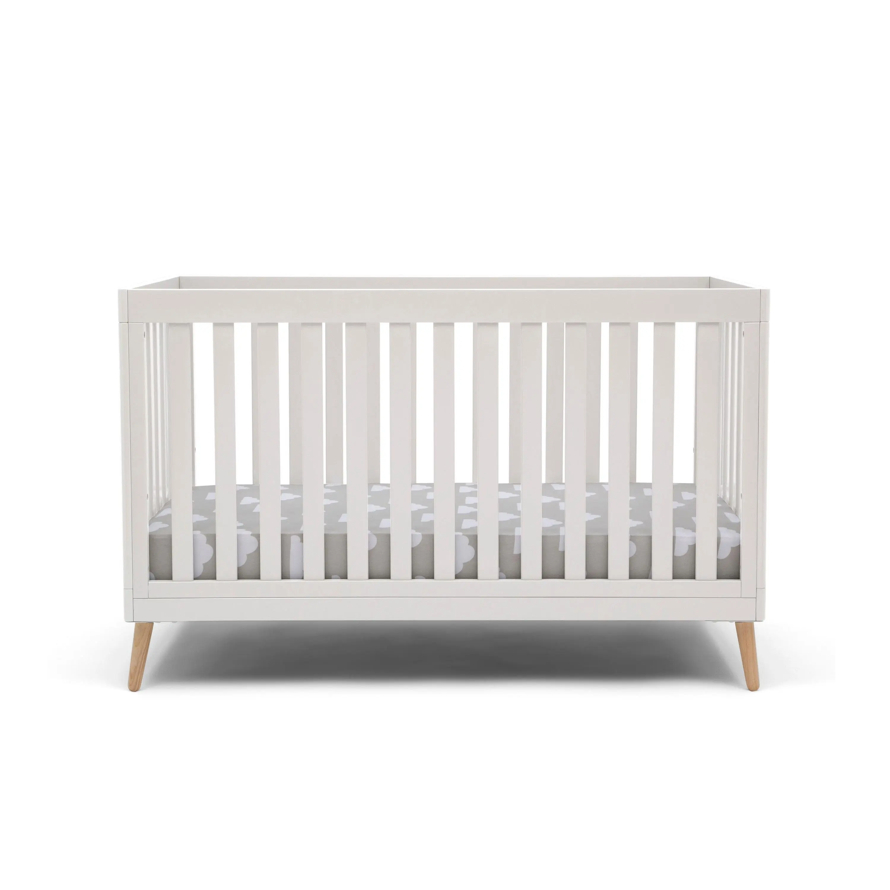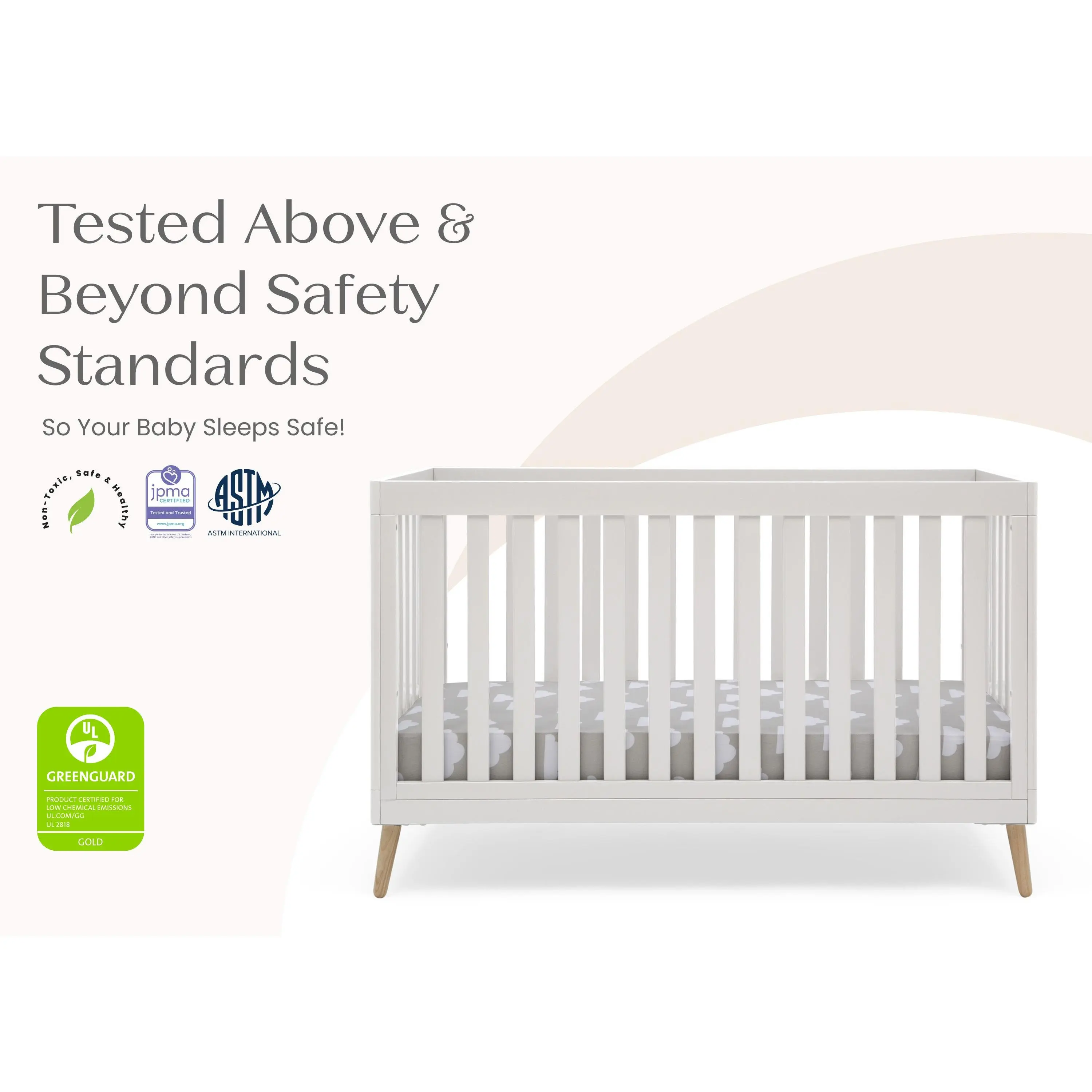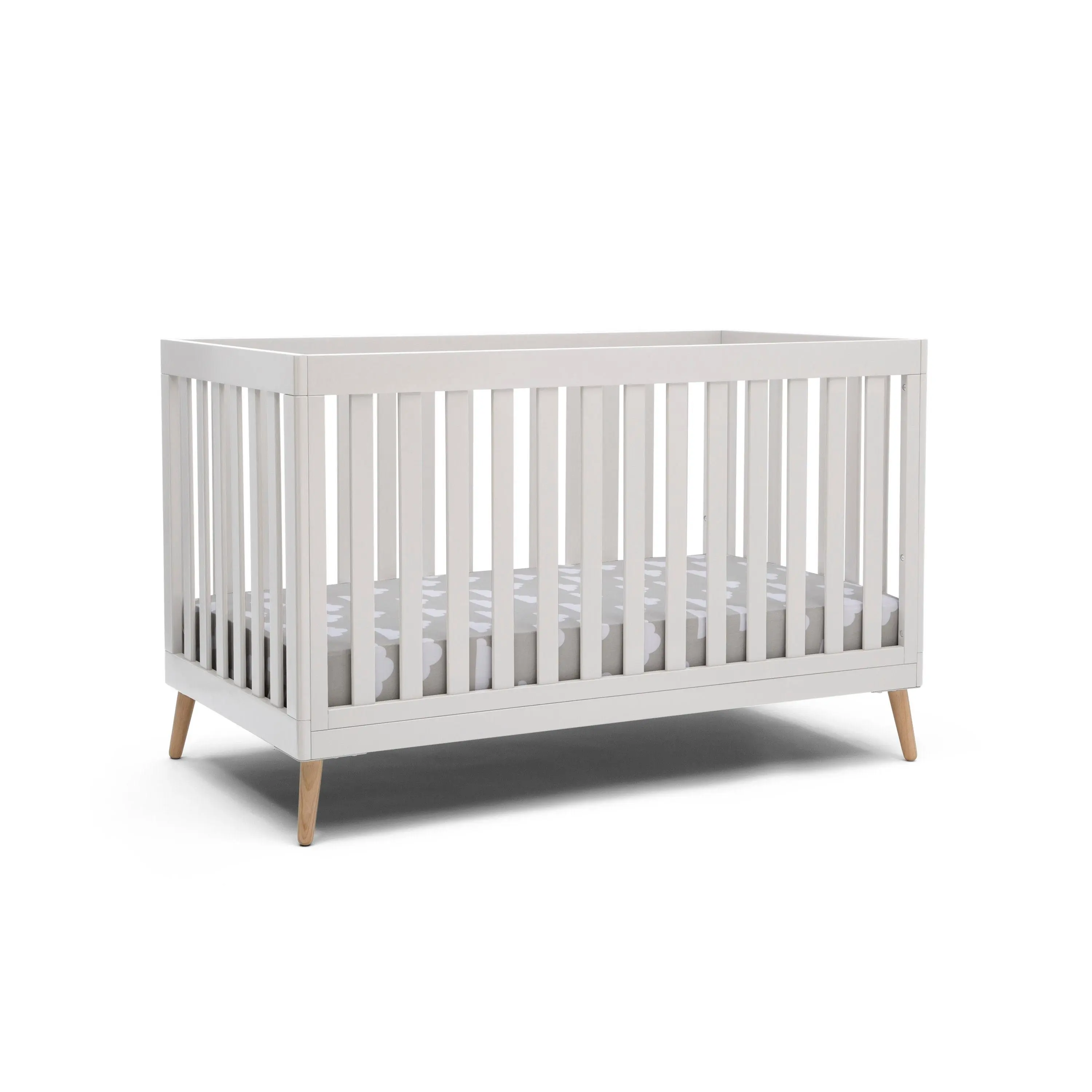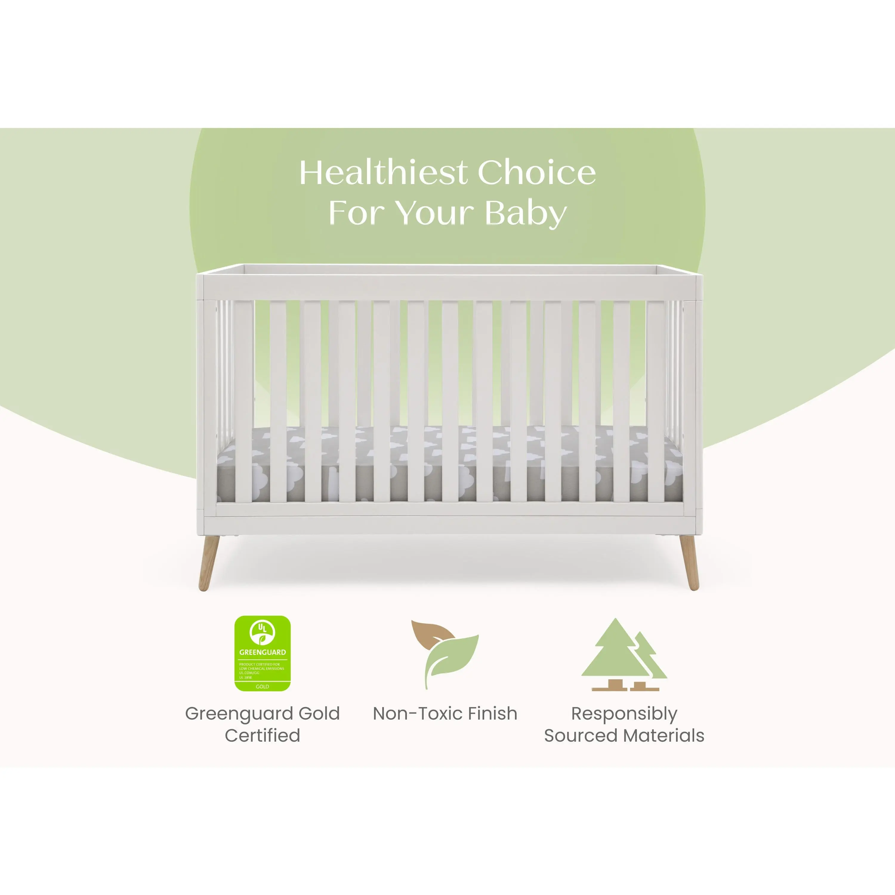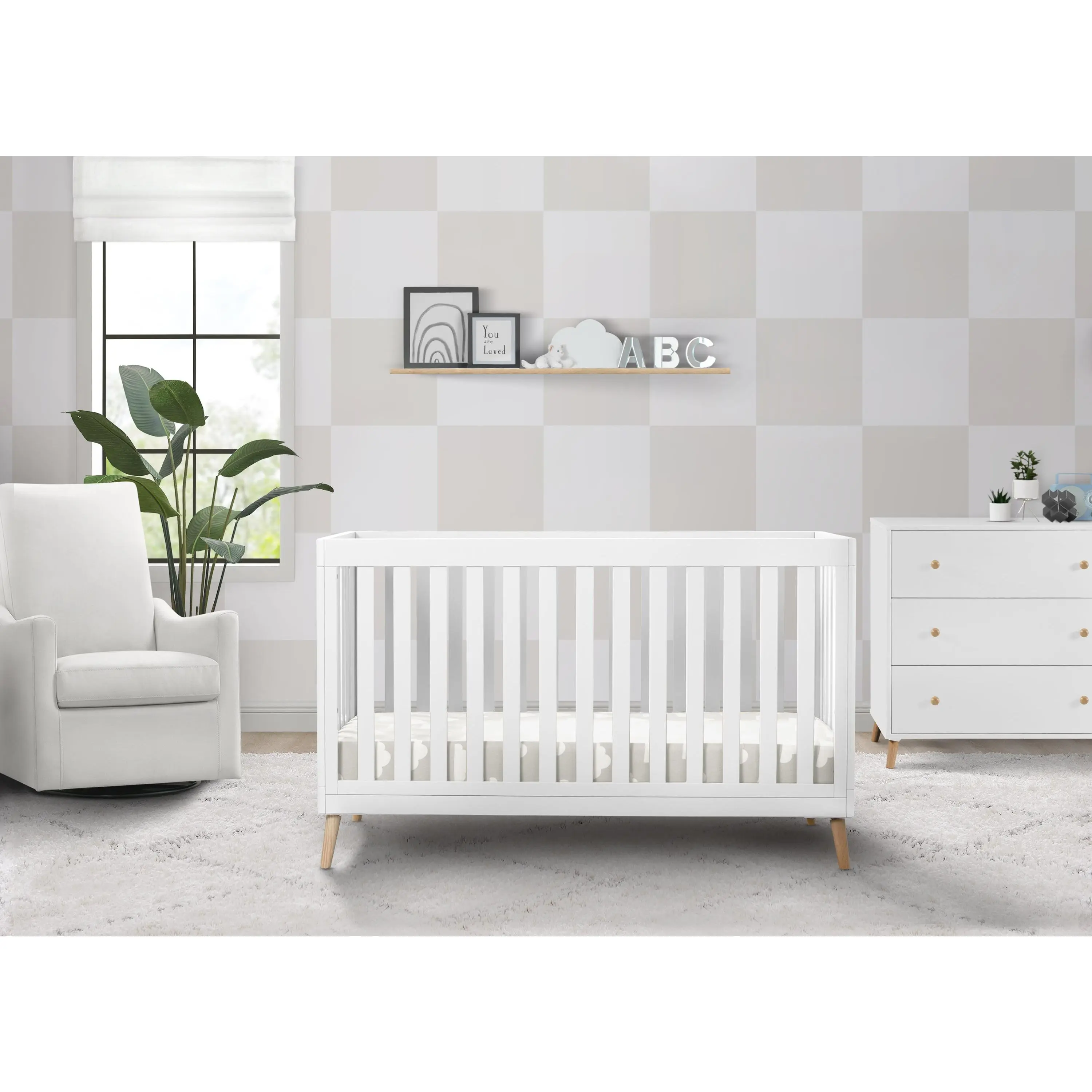 The Essex 4-in-1 Convertible Baby Crib by Delta Children is designed to elevate modern nurseries. It features gently curved corners and splayed feet in a natural finish for some retro cool contrast. The adjustable height mattress allows this crib to grow alongside your little one—start with the mattress at the highest level, then lower it as your baby begins to sit or stand. Once your child outgrows the crib, convert it to a toddler bed, daybed or sofa. To complete your mid-century modern nursery, pair the Essex 4-in-1 Crib with the Essex Changing Table/Bookcase by Delta Children.