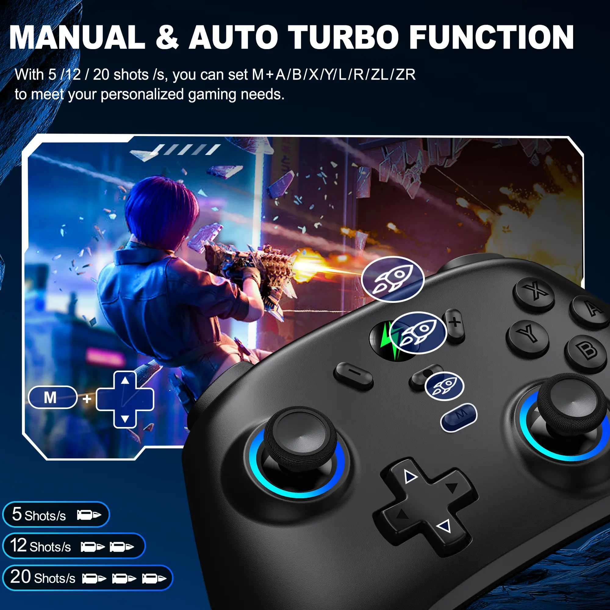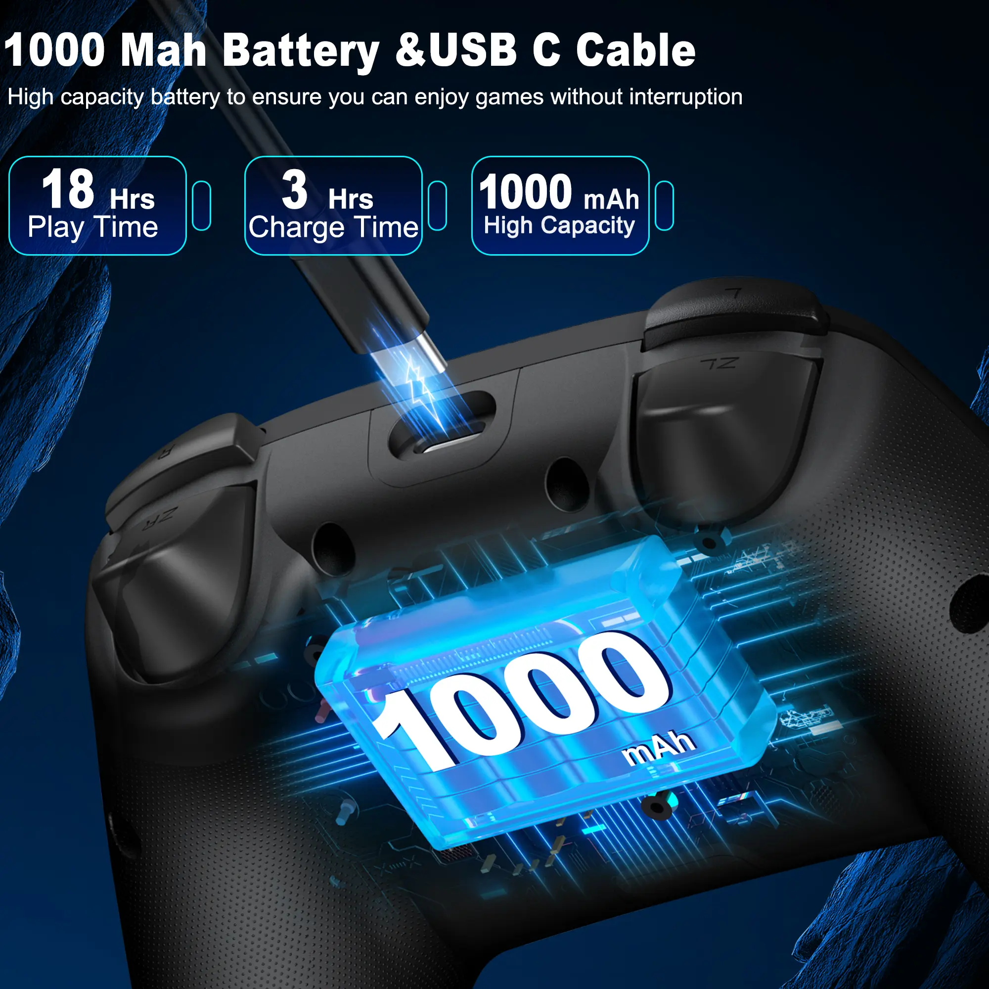 【ADJUSTABLE TURBO & 18H PLAYING TIME】 A/B/X/Y/L/R/ZL/ZR buttons can be set to auto/manual TURBO function, the speed adjustable in three levels, free your fingers and make you easier to win an arcade or action game. 1000mAh high capacity battery provides over 18 hours game playing, and it can be fully charged within 3 hours. Support one key to wake up the switch controller, after the first connection, next time just simply press "HOME" key to wake up and re-connect the pro controller