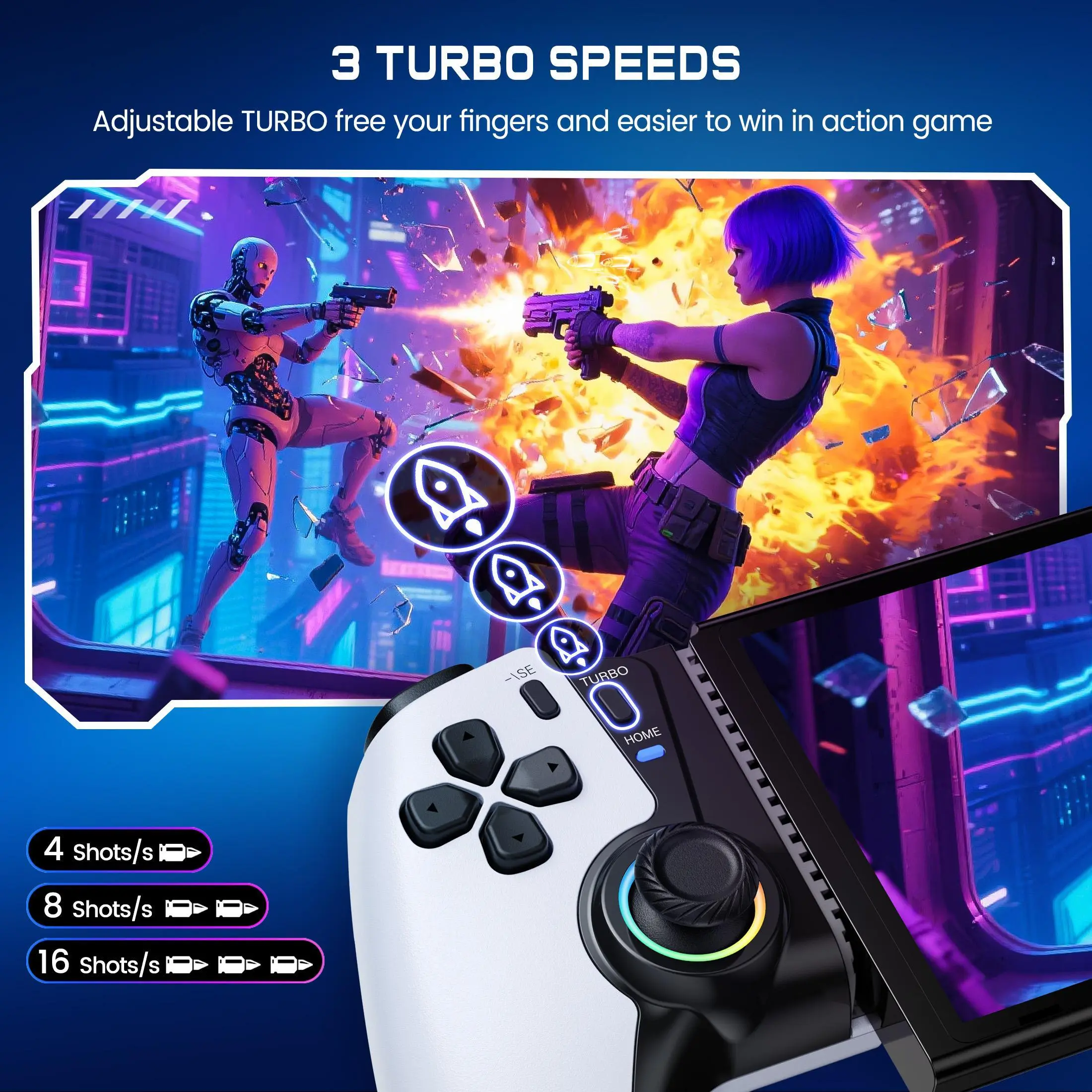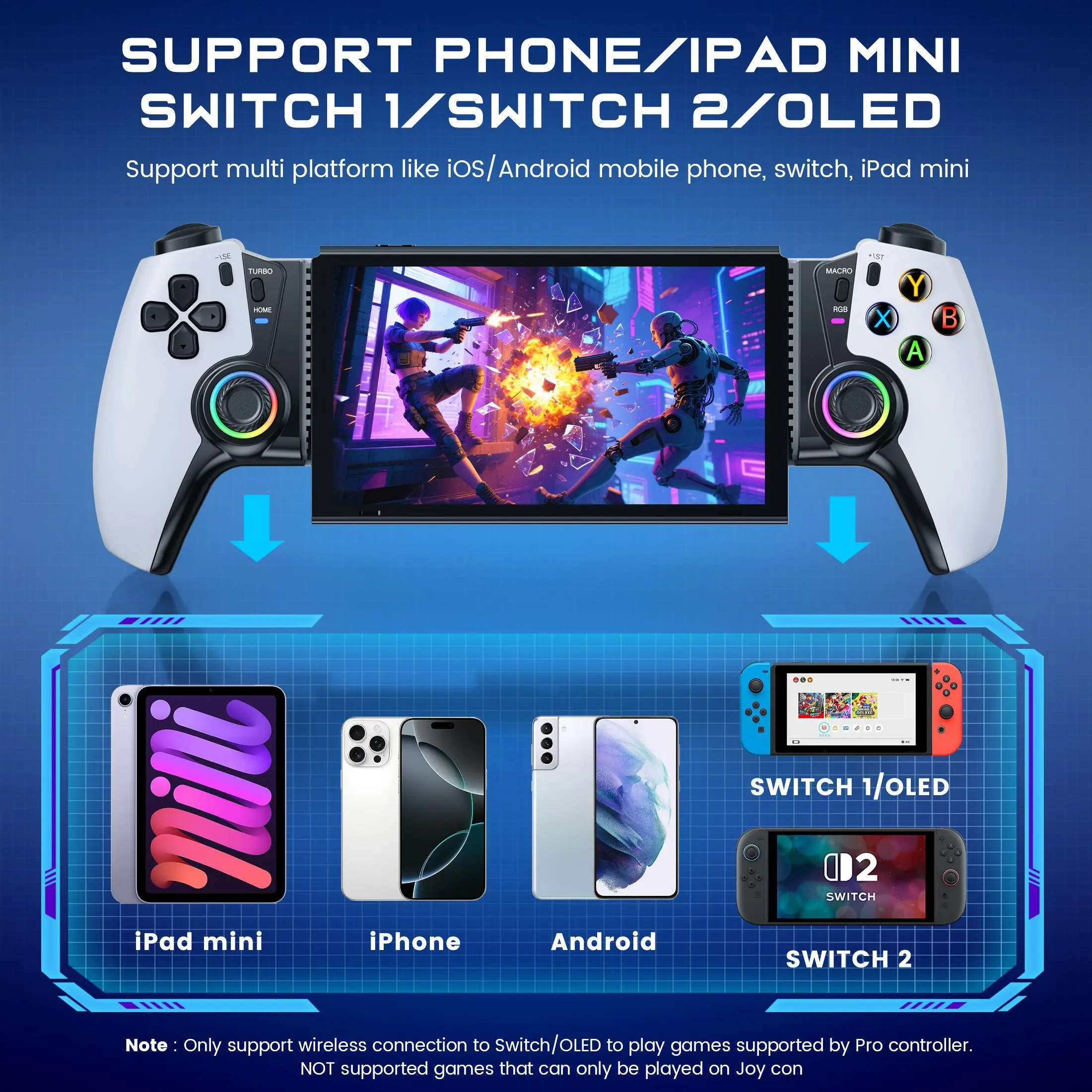 Ever wish your phone could transform into a full-on gaming console? The ESYWEN Mobile Game Controller makes that dream come true. Designed for Android, iPhone, iPad Mini, and Switch consoles, it lets you dive into your favorite games like CODM, Genshin Impact, Xbox titles, and more with wireless ease. The drift-free Hall Effect joysticks and Hall linear triggers deliver pinpoint precision, making every move count. Plus, the two programmable back buttons let you create custom combos for pro-level gameplay. Feel every hit and explosion with adjustable vibration and set the mood with vibrant RGB lighting that you can tweak across 10 effects and 5 brightness levels. The ergonomic anti-slip grips keep your hands comfy during marathon sessions, while the durable mechanical buttons are built to last over 500,000 presses. With a 1000mAh battery, you get up to 14 hours of uninterrupted playtime, and quick Type-C charging means less waiting and more gaming. The telescopic bracket fits most phones and cases from 4.13 to 7.87 inches wide, so you can game comfortably no matter your device. Inside the box, you get the controller and a USB Type-C charging cable. Ready to level up your mobile gaming experience? Grab the ESYWEN controller and turn your phone into the ultimate gaming machine!
