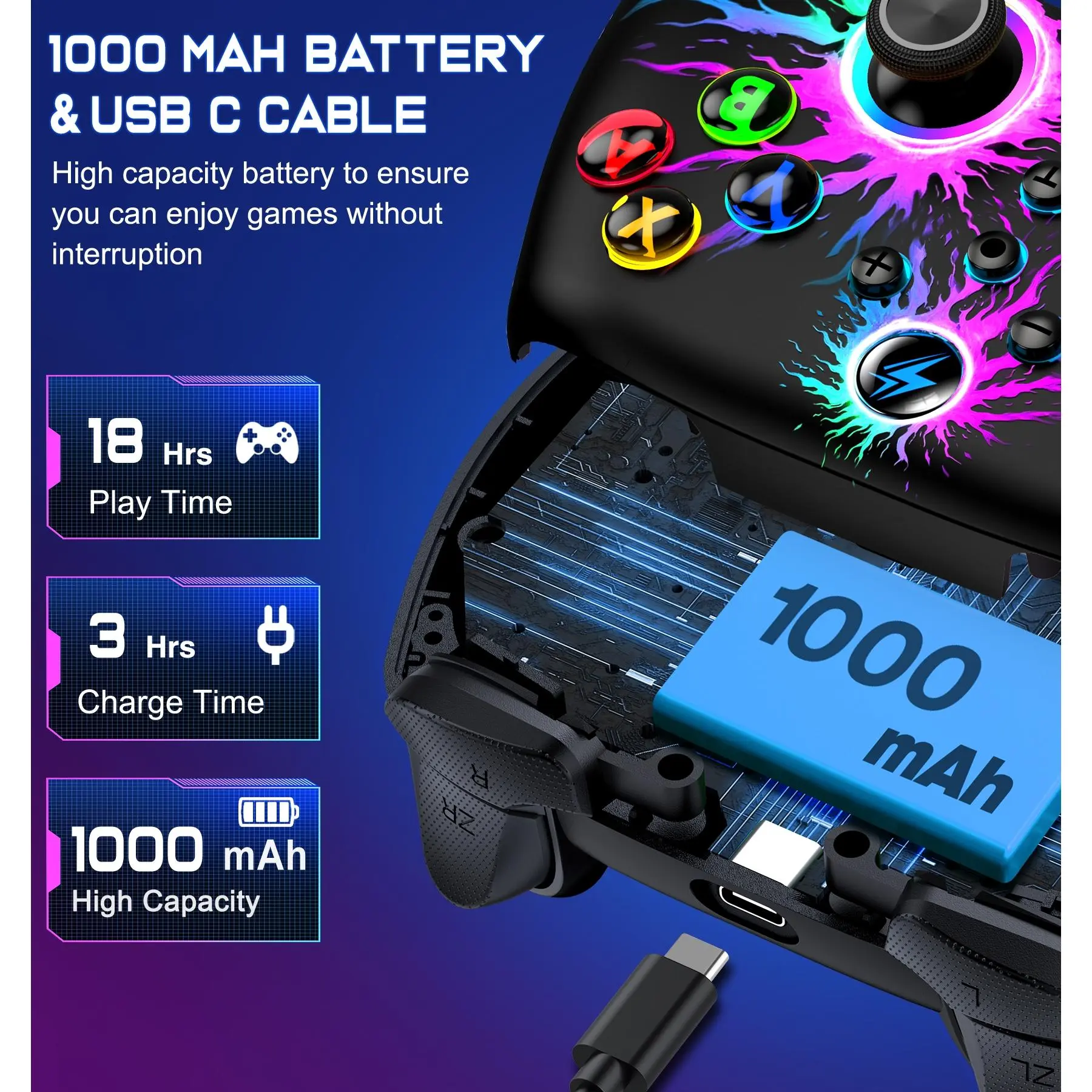 ·【1000mAh HIGH CAPACITY BATTERY】The wireless pro controllers for switch built-in 1000mAh battery which provide more than 16 hours playing time on RGB LED lit mode, you can enjoy longer game playing without interruption, only need 3 hours to fully charged with an included USB type c fast charging cable. Connected state, if no operation within 20 minutes, the controller automatically shut down,simply press "HOME" key to wake up and re-connect your Switch console.