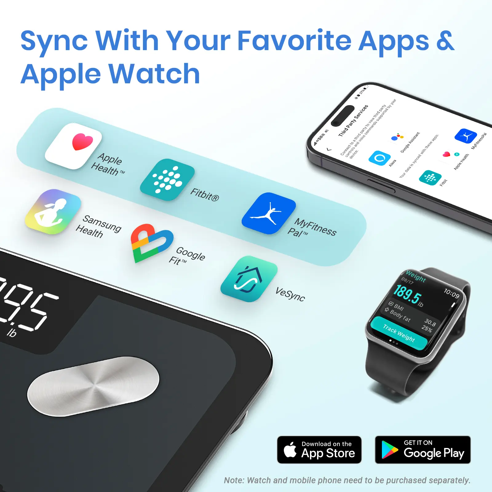 ·Use with Ease: Seamlessly integrate our scale into your fitness routine. Compatible with APPLE WATCH and syncs data with popular fitness apps like Apple Health, Samsung Health, Google Fit, FitBit, and MyFitnessPal. Supports unlimited users for convenience