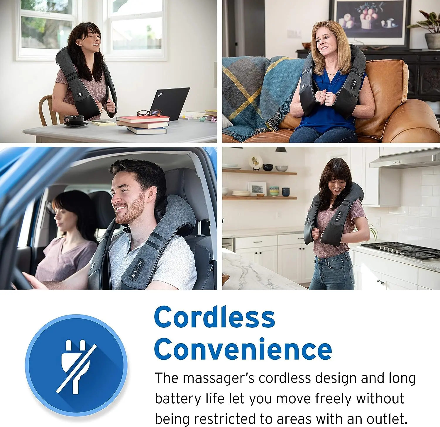 ·Cordless Massager: Enjoy a thorough massage wherever you go without fussing over a tangled mess of cords. Just sit back, relax, and let the back massager soothe your aching muscles. You can easily recharge the battery when you’re done
