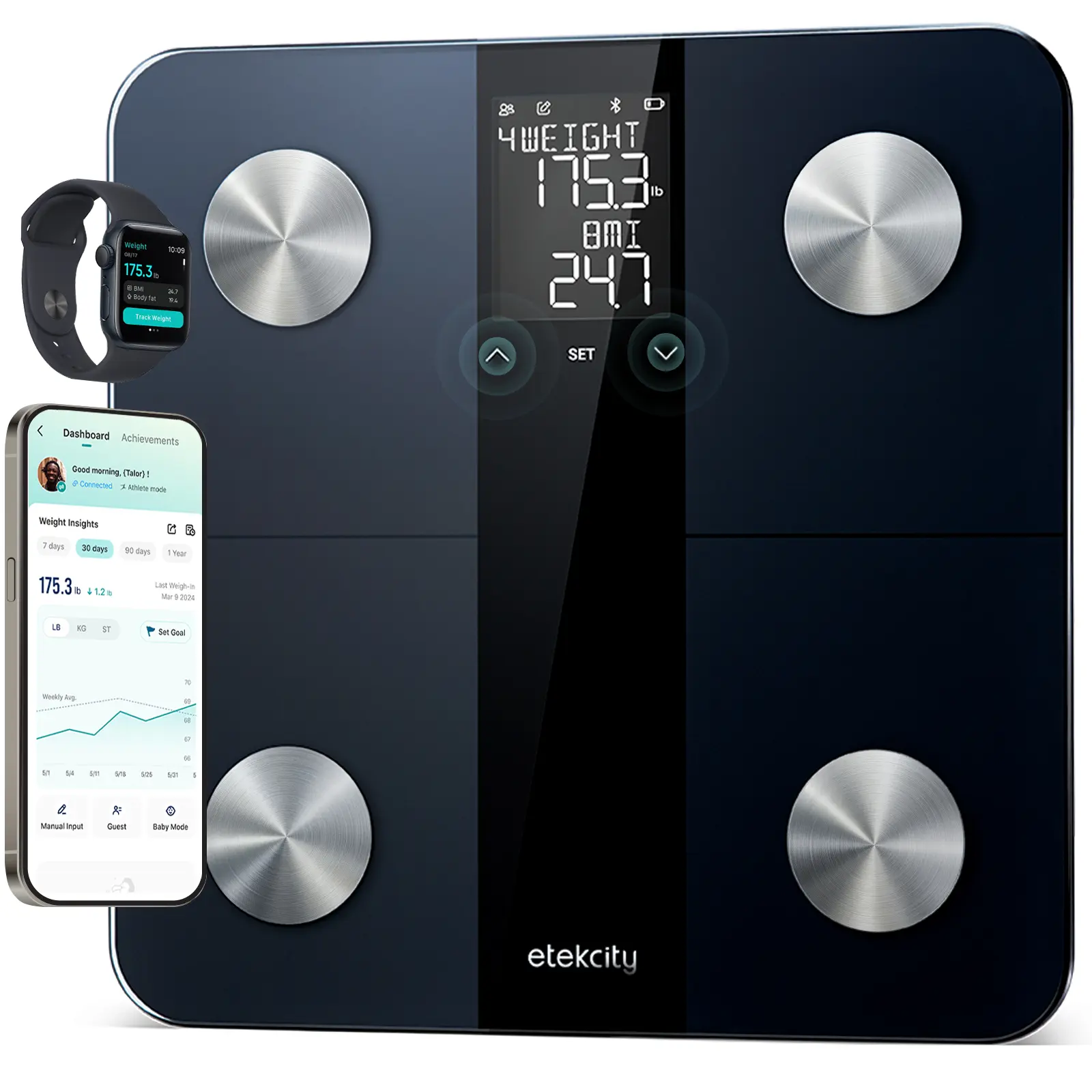 Note: This body fat scale features a new mode that allows you to use it entirely without a phone. Simply toggle the switch on the back and input your personal information using the button below the display for a completely mobile-free experience