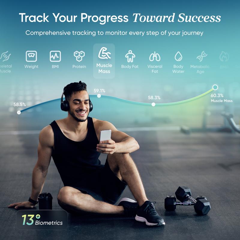 Track Your Progress Toward Success: Our scale not only monitors 13 key body composition metrics but also tracks your calorie intake and provides multi-dimensional body circumference tracking to celebrate every step of your progress